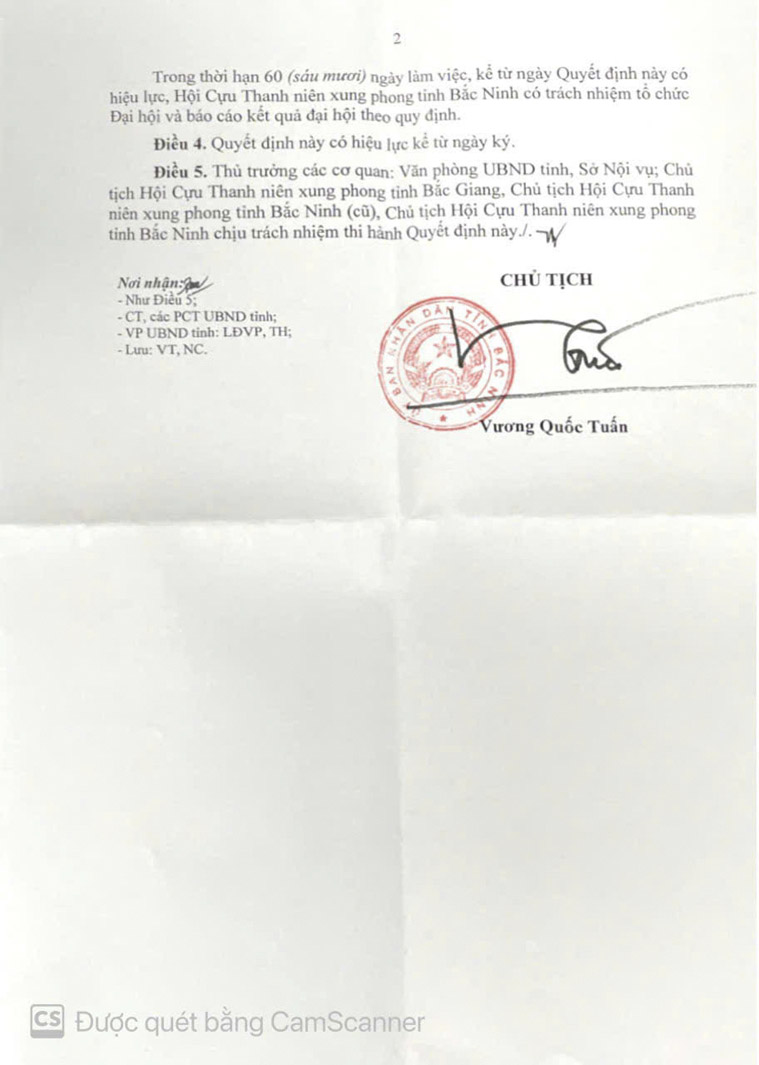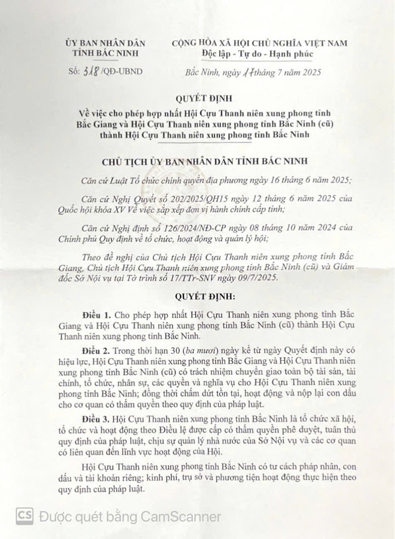 Quyết định hợp nhất Hội Cựu TNXP tỉnh Bắc Giang và Hội Cựu TNXP tỉnh Bắc Ninh (cũ) thành Hội Cựu TNXP tỉnh Bắc Ninh