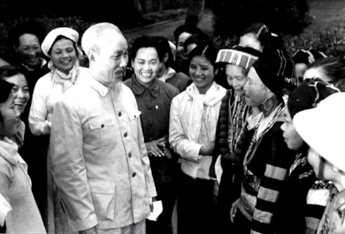 Bác Hồ với đại biểu phụ nữ dân tộc thiểu số, tại Đại hội Phụ nữ toàn quốc lần thứ III, tháng 3/1961. Ảnh: TL