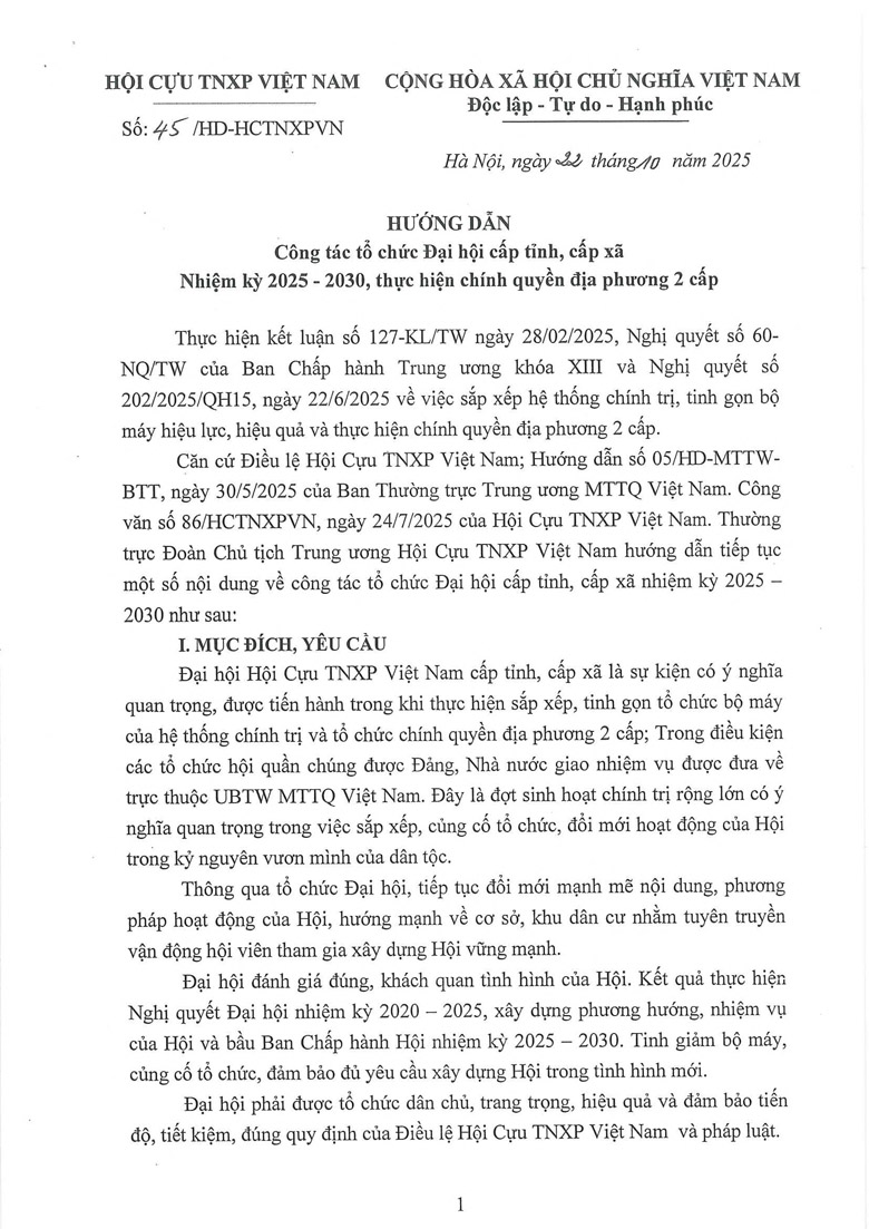 Hướng dẫn 45 về công tác tổ chức Đại hội cấp tỉnh, cấp xã nhiệm kỳ 2025 – 2030, thực hiện chính quyền địa phương 2 cấp