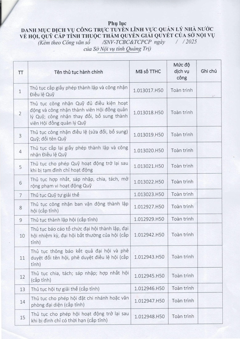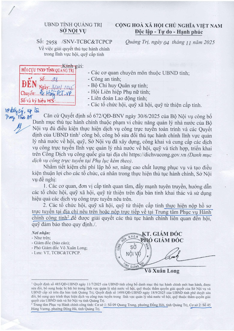 Công văn 2958 của Sở Nội vụ Quảng Trị về giải quyết thủ tục hành chính trong lĩnh vực hội, quỹ cấp tỉnh