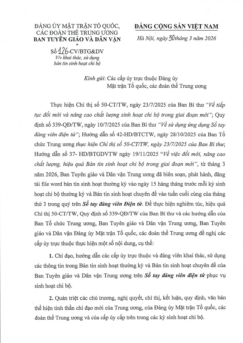 Công văn 126 về khai thác, sử dụng bản tin sinh hoạt chi bộ