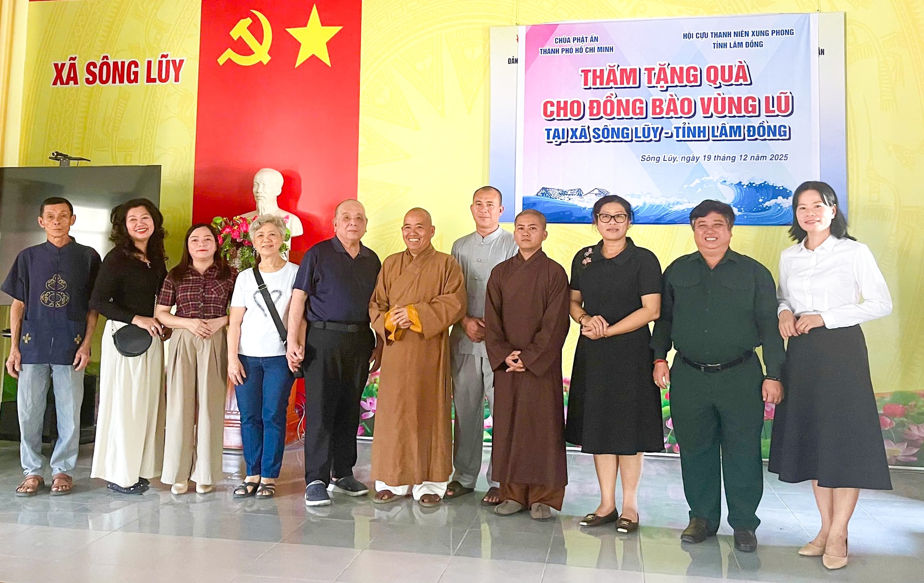 Thấu hiểu những mất mát đó, Hội Cựu TNXP tỉnh Lâm Đồng đã phối hợp với Chùa Phật Ấn (TP. Hồ Chí Minh) và các nhà hảo tâm trực tiếp về tận rốn lũ để thăm hỏi và động viên bà con.
