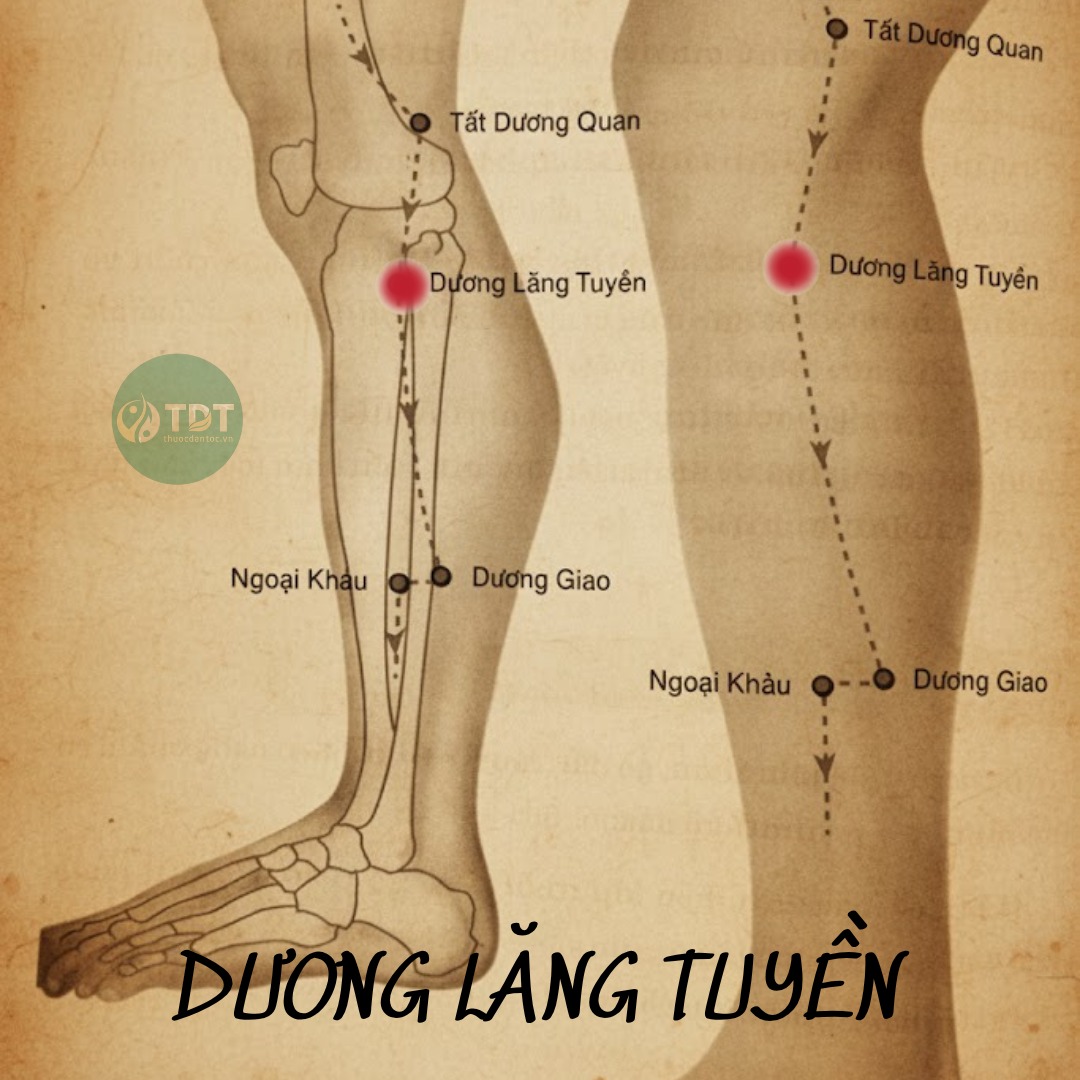 - Bước 3 (Chi dưới): Dùng ngón tay cái ấn huyệt DƯƠNG LĂNG TUYỀN 30 lần, với lực vừa phải (trong khoảng 3 phút).