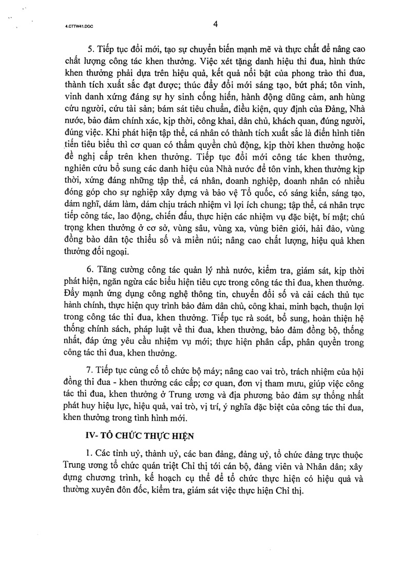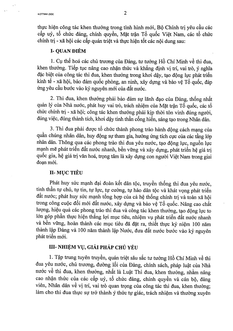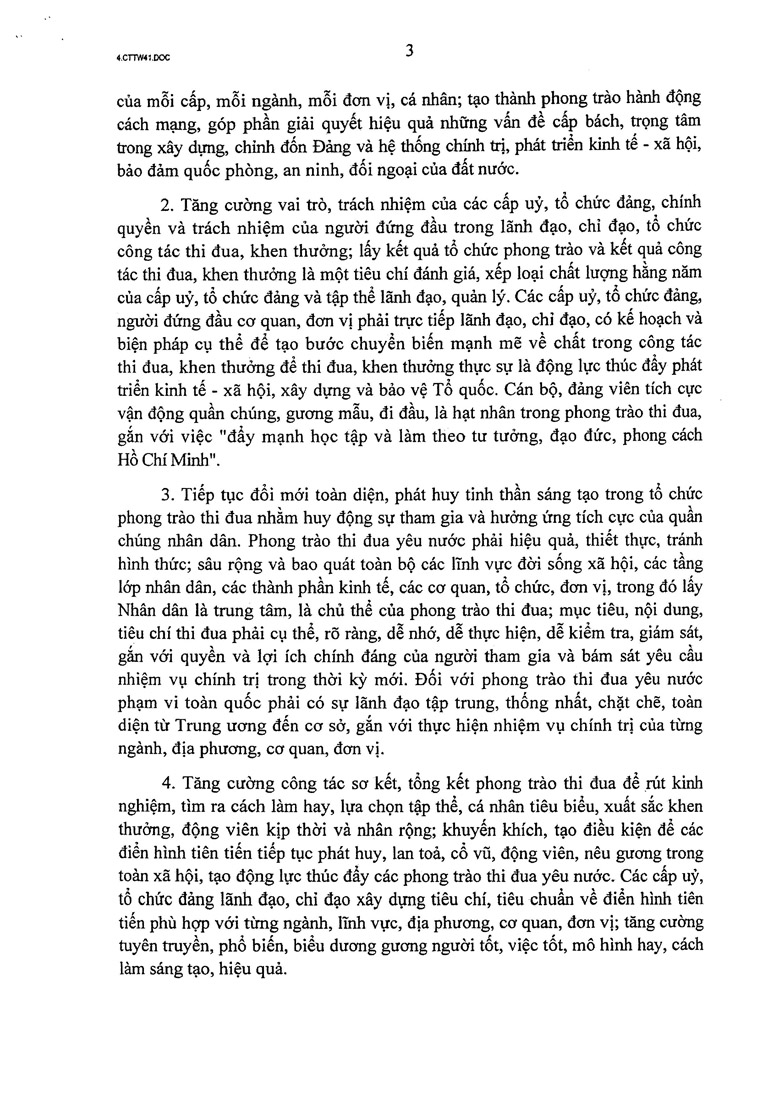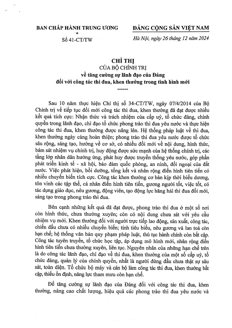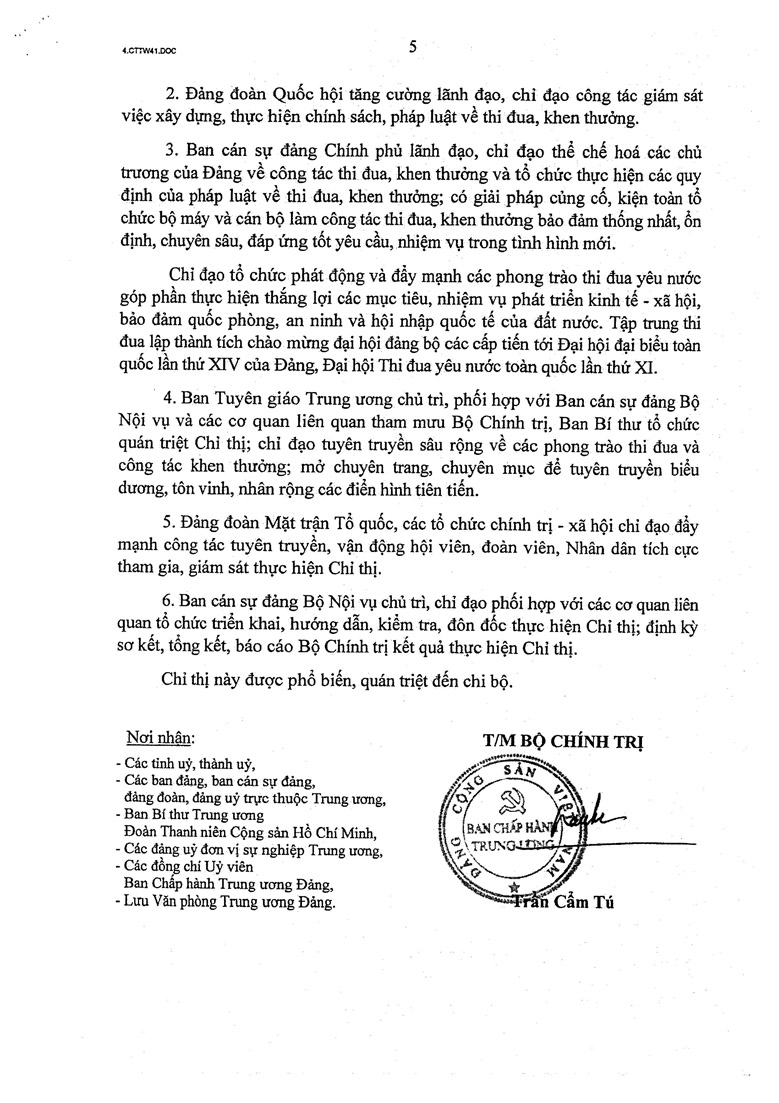 Chỉ thị của Bộ Chính trị về tăng cường công tác thi đua, khen thưởng trong tình hình mới