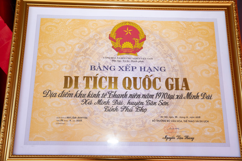 Sáng 19/9/2025, lãnh đạo xã Minh Đài[1] long trọng tổ chức lễ công bố Quyết định xếp hạng Di tích lịch sử cấp Quốc gia: Địa điểm Khu Kinh tế Thanh niên năm 1970 tại xã Minh Đài. Dự lễ kỷ niệm có các đồng chí Phan Trọng Tấn – Ủy viên BTV Tỉnh uỷ, Phó Chủ tịch UBND tỉnh; Trần Đình Thành – Phó Cục trưởng Cục di sản văn hoá- Bộ VH, TT & DL; đại diện Trung ương Hội Cựu TNXP Việt Nam, Trung ương Đoàn TNCS Hồ Chí Minh, đại diện lãnh đạo Sở VH, TT& DL, Sở GD & ĐT, Hội Cựu TNXP tỉnh… cùng đông đảo cựu TNXP Khu kinh tế thanh niên Minh Đài.