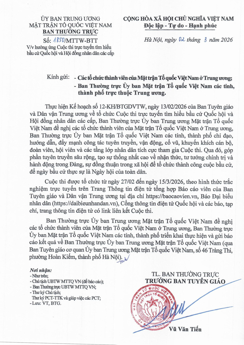 Công văn 1850 hưởng ứng Cuộc thi trực tuyến tìm hiểu bầu cử Quốc hội và Hội đồng nhân dân các cấp