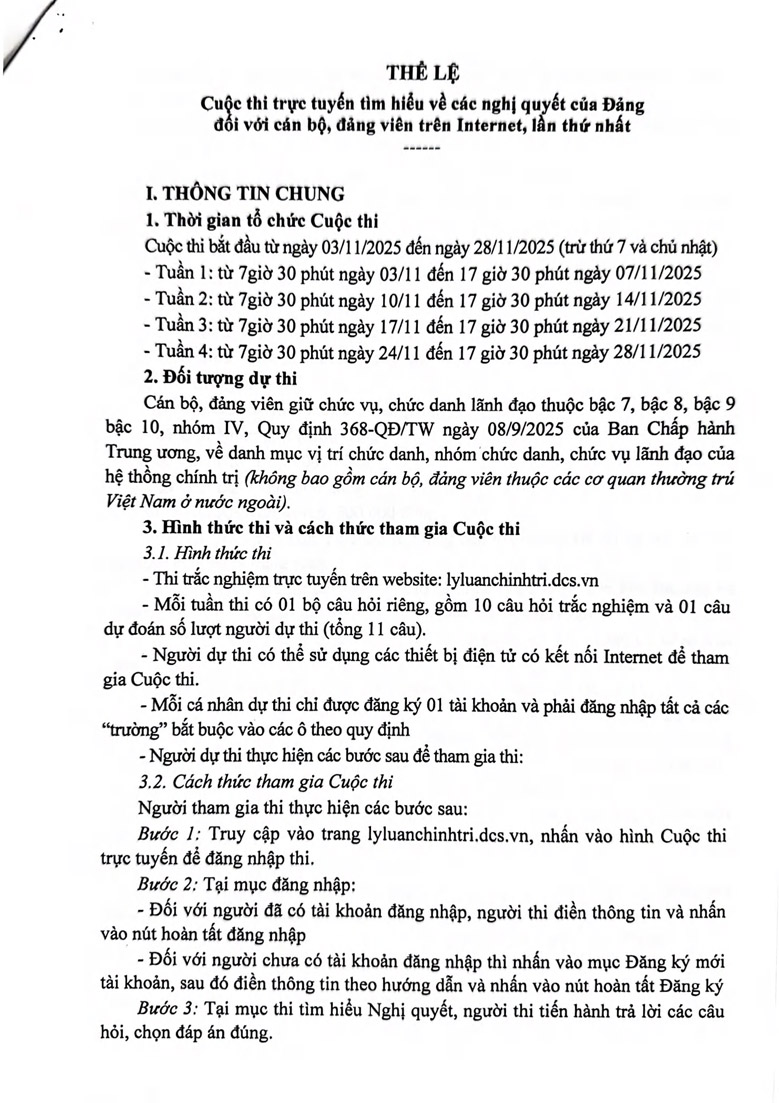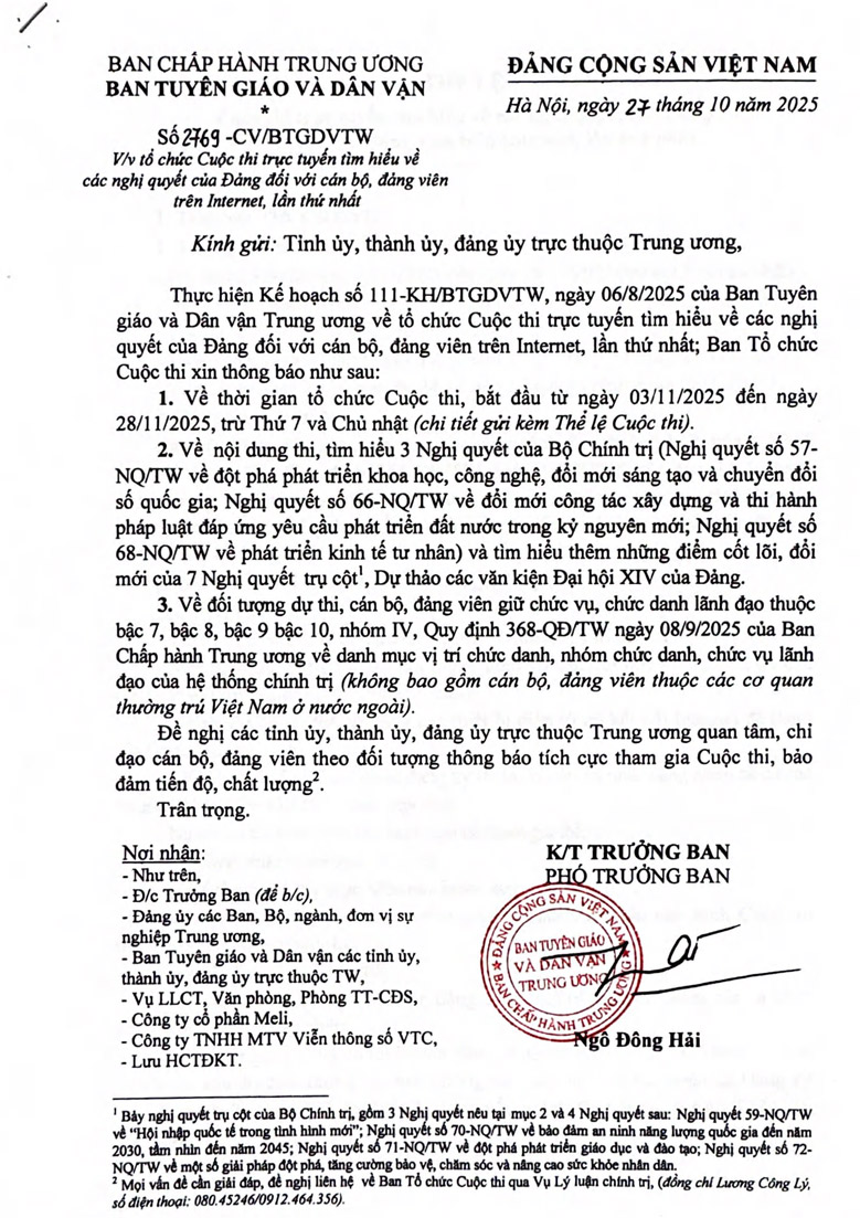 Công văn 2769 về tổ chức Cuộc thi trực tuyến tìm hiểu về cảc nghị quyết của Đảng đối với cán bộ, đảng viên trên Internet, lần thứ nhất