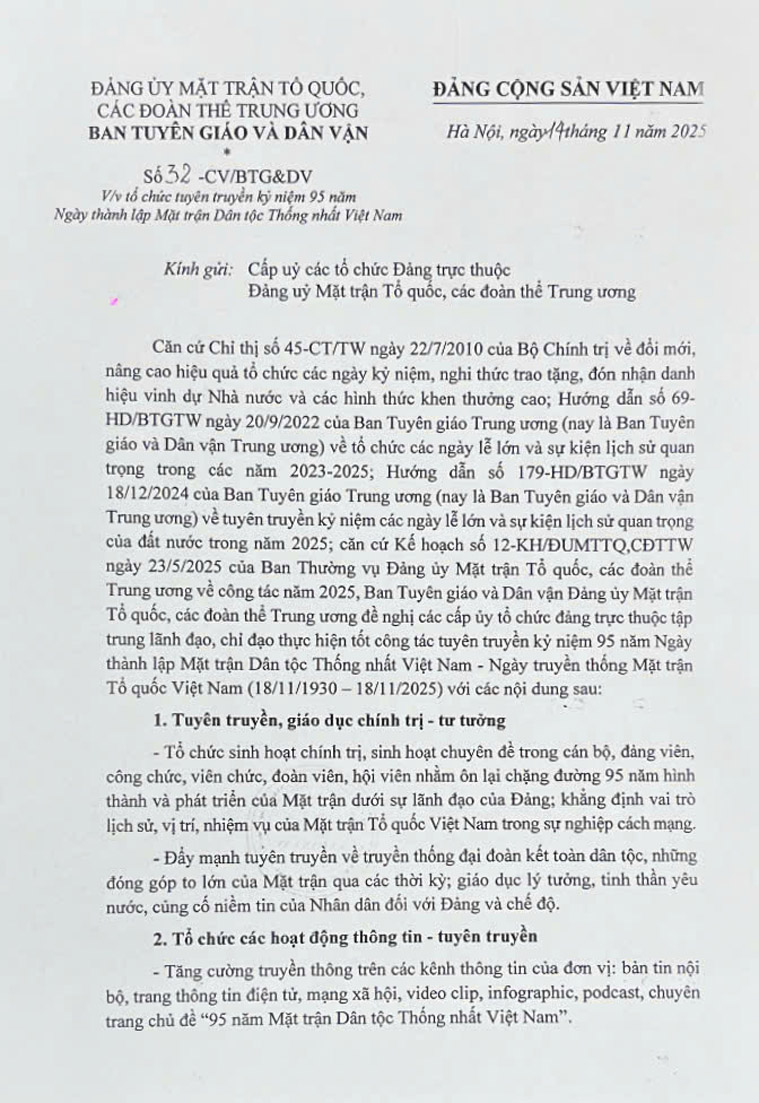 Công văn 32: Tổ chức tuyên truyền kỷ niệm 95 năm Ngày thành lập Mặt trận Dân tộc Thống nhất Việt Nam