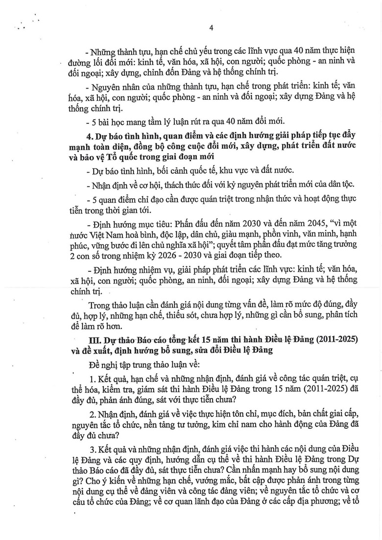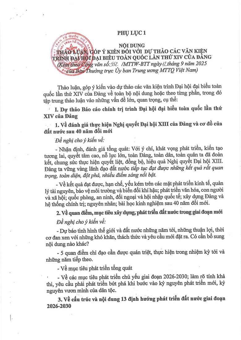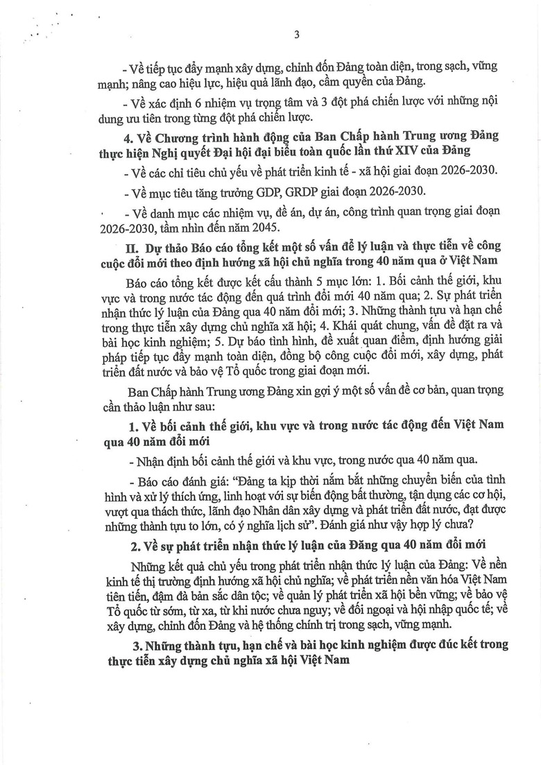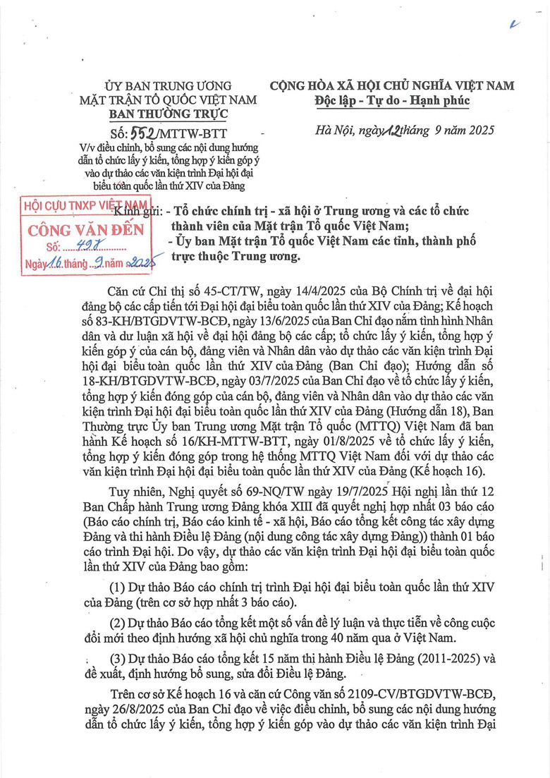 Công văn 552 điều chỉnh, bổ sung các nội dung hưỏng dẫn tổ chức lấy ý kiến, tổng hợp ý kiến góp ý vào dự thảo các văn kiện trinh Đại hội đại biểu toàn quốc lần thứ XIV của Đảng