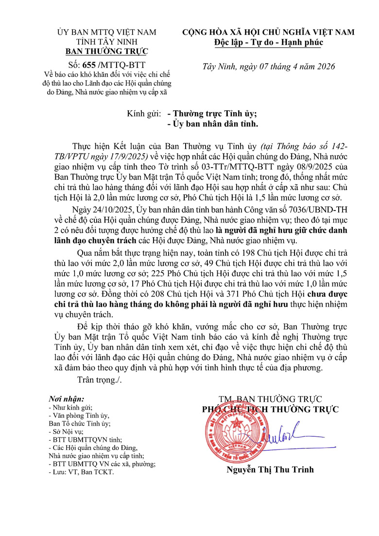 Công văn 655 báo cáo khó khăn đối với việc chi chế độ thù lao cho lãnh đạo các Hội quần chúng do Đảng, Nhà nước giao nhiệm vụ cấp xã