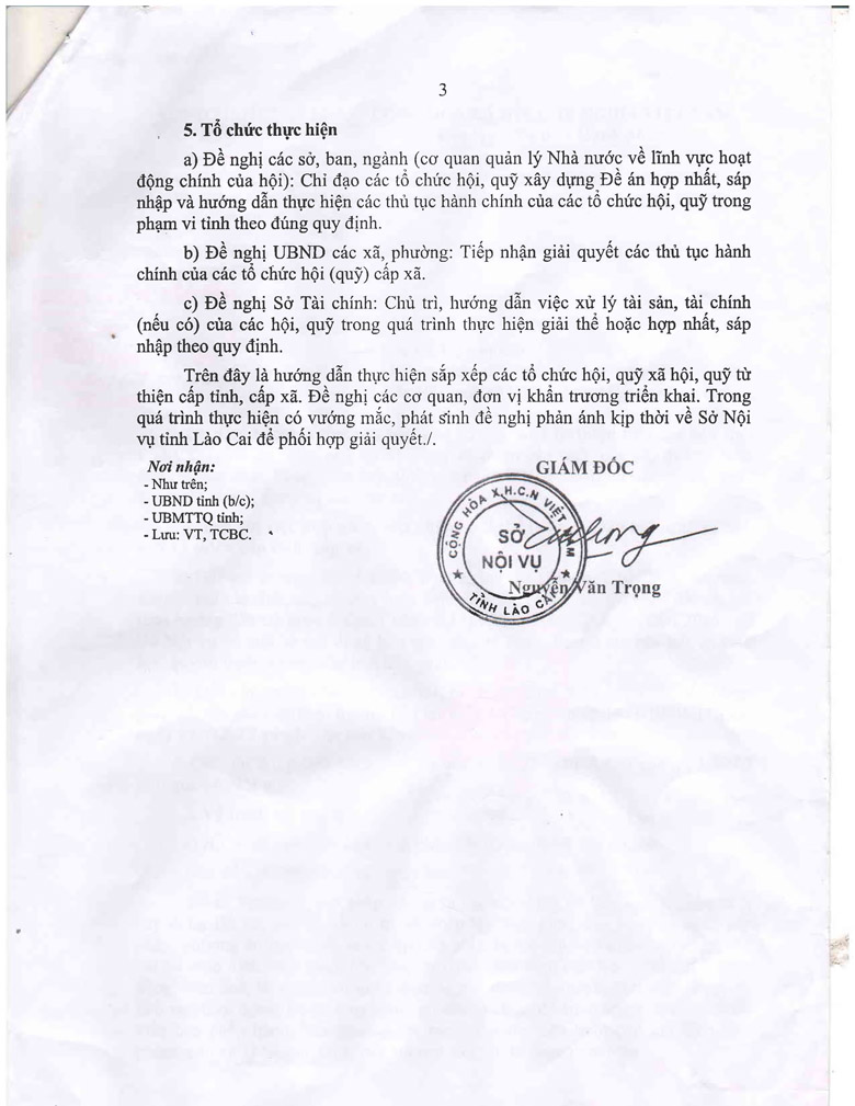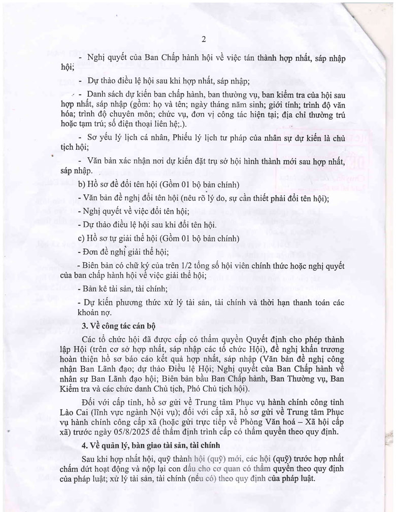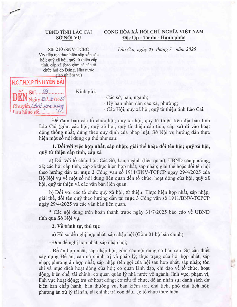 Công văn của Sở Nội vụ Lào Cai về tiếp tục thực hiện sắp xếp các hội; quỹ xã hội, quỹ từ thiện cấp tỉnh, cấp xã (bao gồm cả các tổ chức hội do Đảng, Nhà nước giao nhiệm vụ)