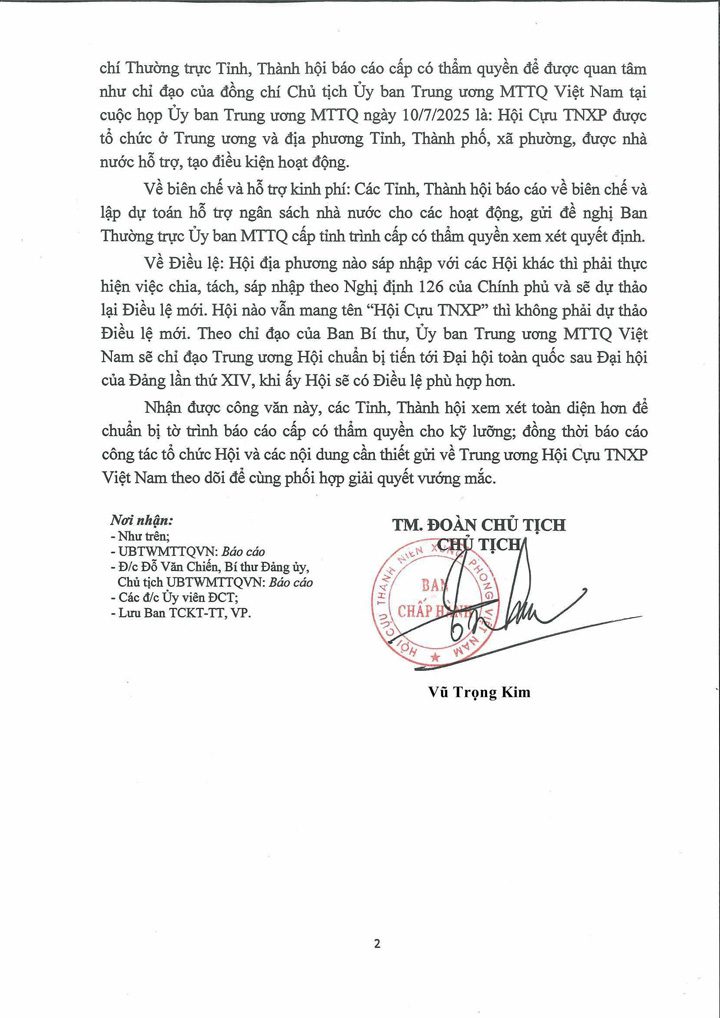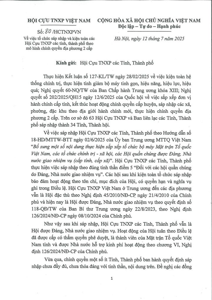 Công văn về việc tổ chức sáp nhập và kiện toàn Hội Cựu TNXP các tỉnh, thành phố theo mô hình chính quyền địa phương 2 cấp