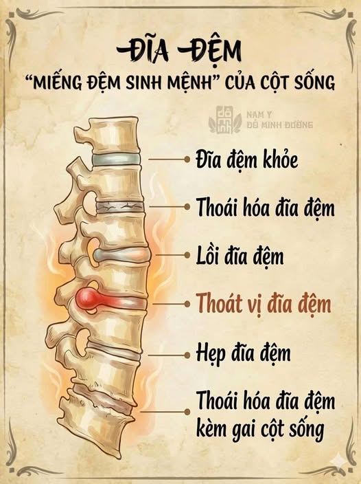 Trong cấu trúc tinh vi của hệ vận động, đĩa đệm đóng vai trò là “trạm giảm chấn” tối quan trọng, giúp cột sống chịu đựng được áp lực từ trọng lượng cơ thể và các hoạt động thường nhật. Sức khỏe của toàn bộ khung xương trục phụ thuộc mật thiết vào tình trạng bảo tồn của đĩa đệm. Theo quan niệm sâu sắc của Đông y, khi khí huyết tắc nghẽn không thể nuôi dưỡng vùng thắt lưng, kết hợp với tạng Thận suy yếu – nơi chủ quản xương khớp – sẽ dẫn đến tình trạng đĩa đệm bị “khô” nhựa sống, mất đi độ đàn hồi tự nhiên. Đây chính là khởi đầu của quá trình thoái hóa âm thầm, tích tụ lâu ngày thành thoát vị, gây ra những cơn đau dữ dội lan tỏa xuống chân, ảnh hưởng nghiêm trọng đến khả năng đi lại.