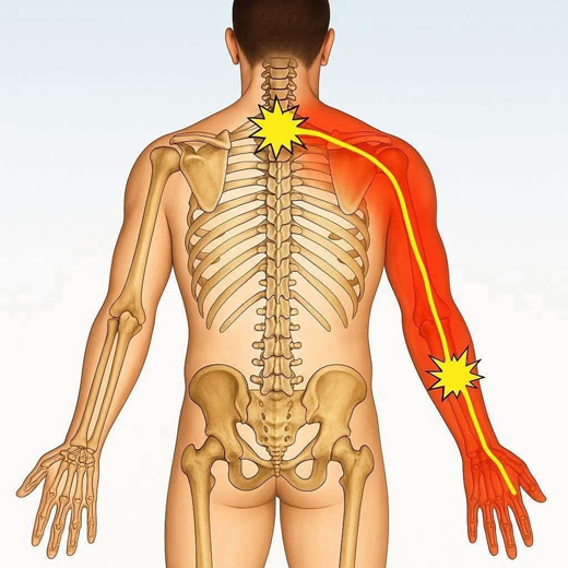 Trong cơ thể con người, cột sống cổ, vai và cánh tay liên kết chặt chẽ qua hệ thống kinh lạc dày đặc. Khi khí huyết bị ứ trệ, đặc biệt là do các yếu tố phong – hàn – thấp xâm nhập hoặc do căng thẳng, lao lực kéo dài, sẽ sinh ra các triệu chứng điển hình như: cổ vai cứng, đau nhói lan xuống cánh tay và tê bì bàn tay. Nếu tình trạng này kéo dài, bệnh dễ dẫn đến thoái hóa cột sống cổ và chèn ép rễ thần kinh, ảnh hưởng nghiêm trọng đến sinh hoạt.