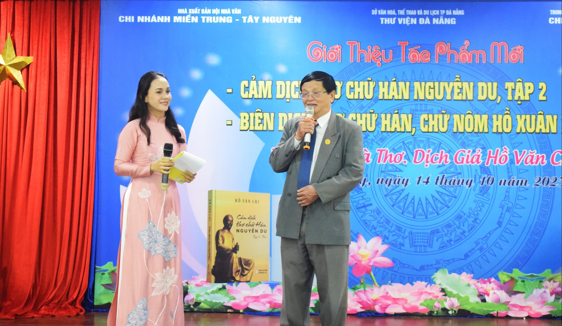 Dịch giả Hồ Văn Chi (phải) tại buổi ra mắt sách “Cảm dịch thơ chữ Hán Nguyễn Du” tập 2 và “Thơ chữ Hán, chữ Nôm Hồ Xuân Hương” tại Thư viện Khoa học Tổng hợp Đà Nẵng Đà Nẵng.