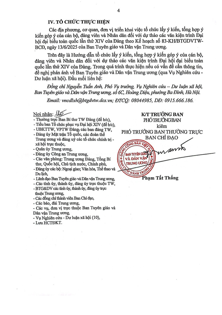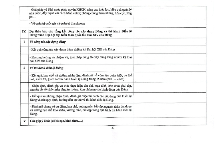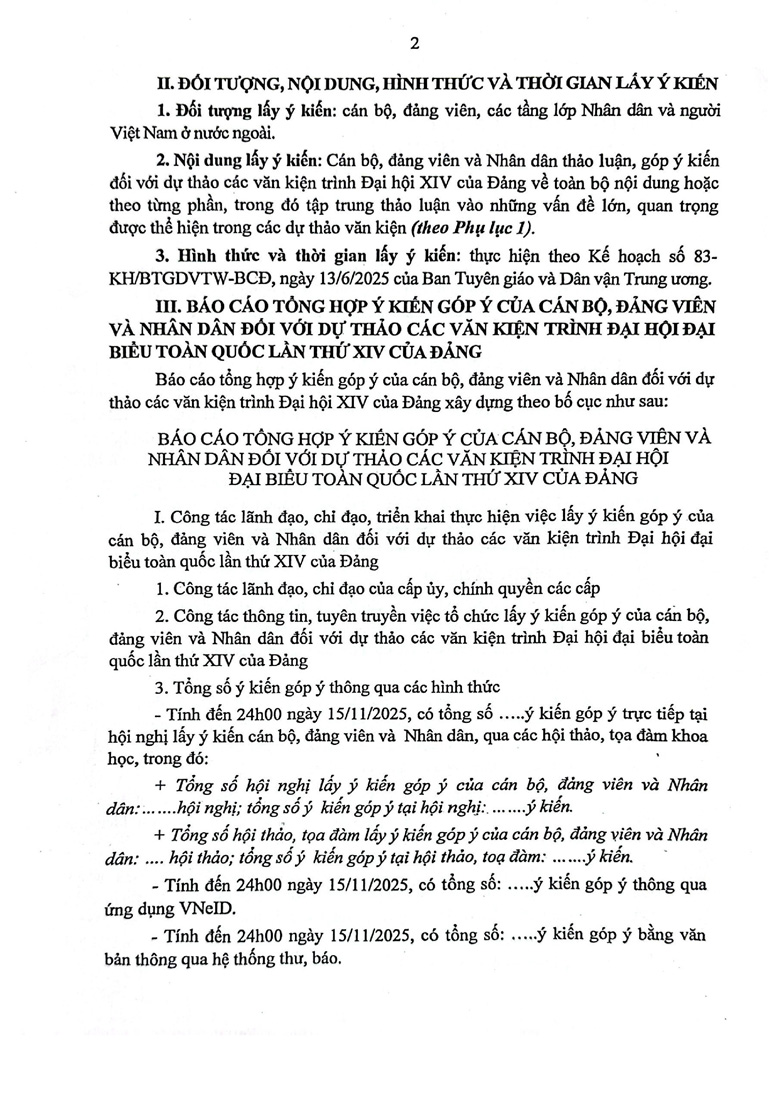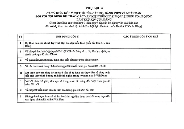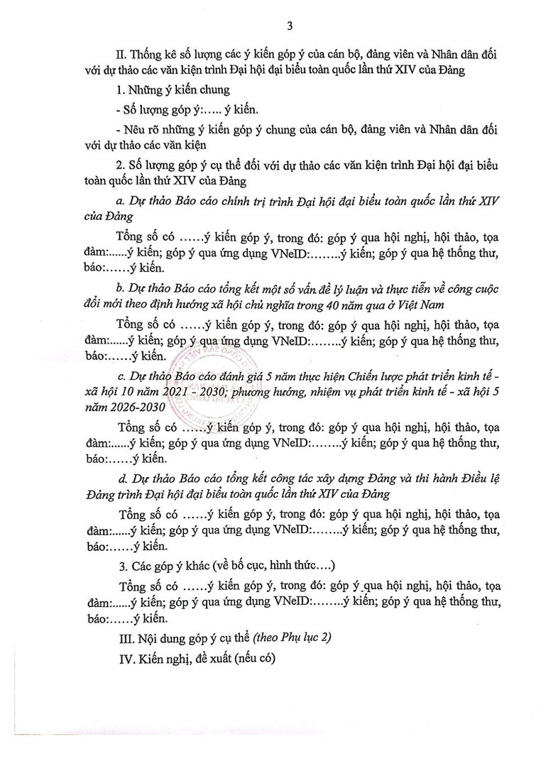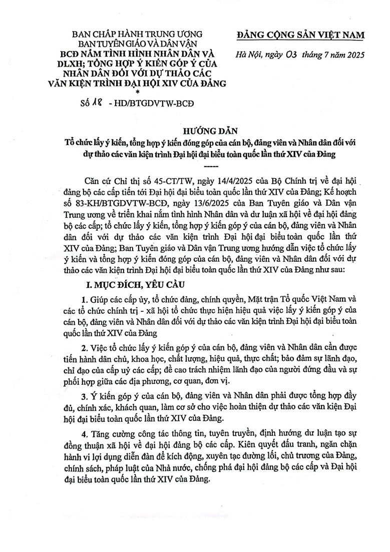 Hướng dẫn 18 tổ chức lấy ý kiến, tổng hợp ý kiến đóng góp của cán bộ, đảng viên và Nhân dân đối với dự thảo các văn kiện trình Đại hội đại biểu toàn quốc lần thứ XIV của Đảng