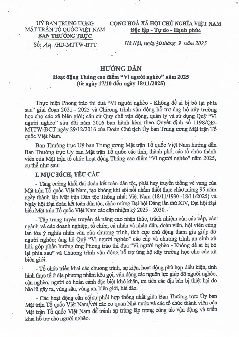 Hướng dẫn hoạt động Tháng cao điểm “Vì người nghèo” năm 2025 (từ ngày 17/10 đến ngày 18/11/2025)