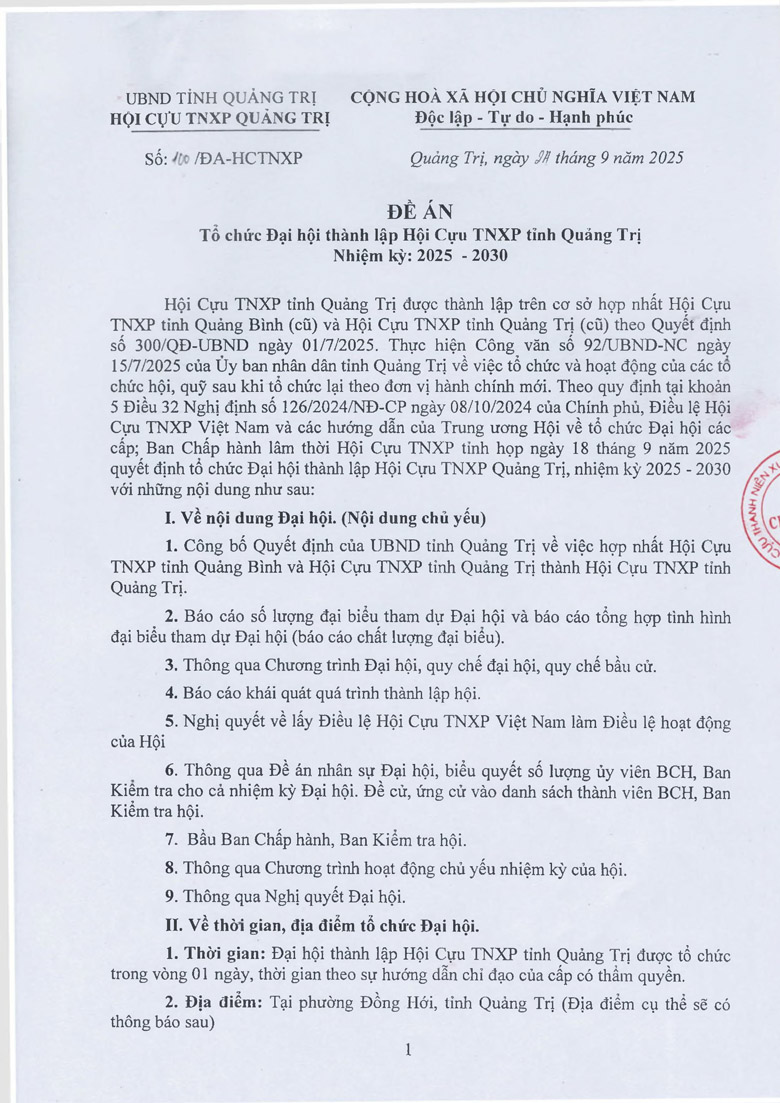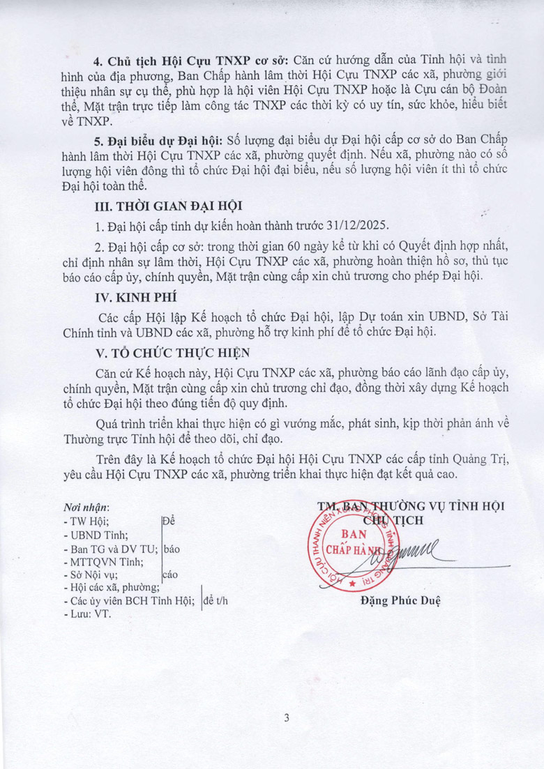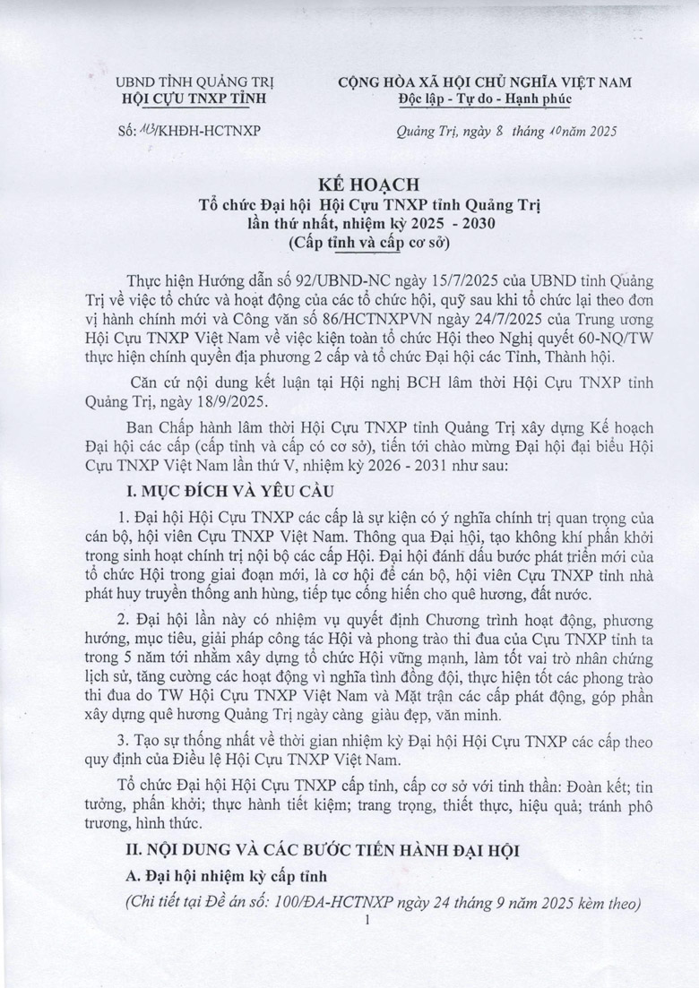 Kế hoạc tổ chức Đại hội Hội Cựu TNXP tỉnh Quảng Trị lần thú’ nhất, nhiệm kỳ 2025 – 2030 Download văn bản: F Chia sẻ Tweet