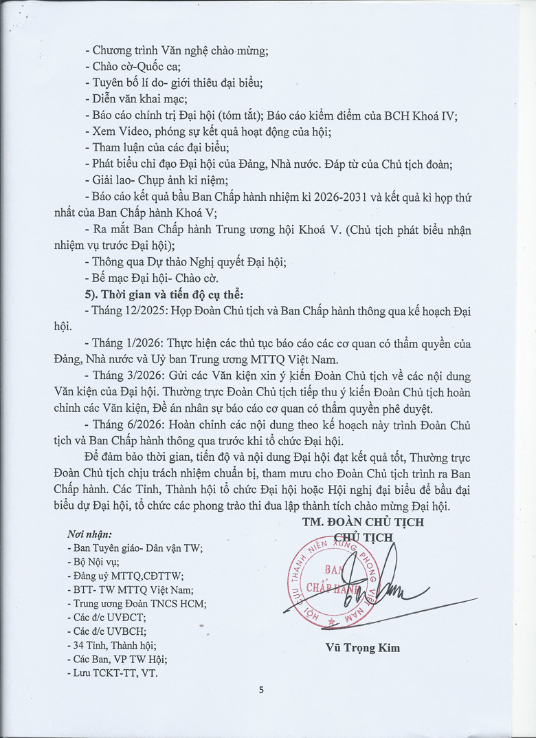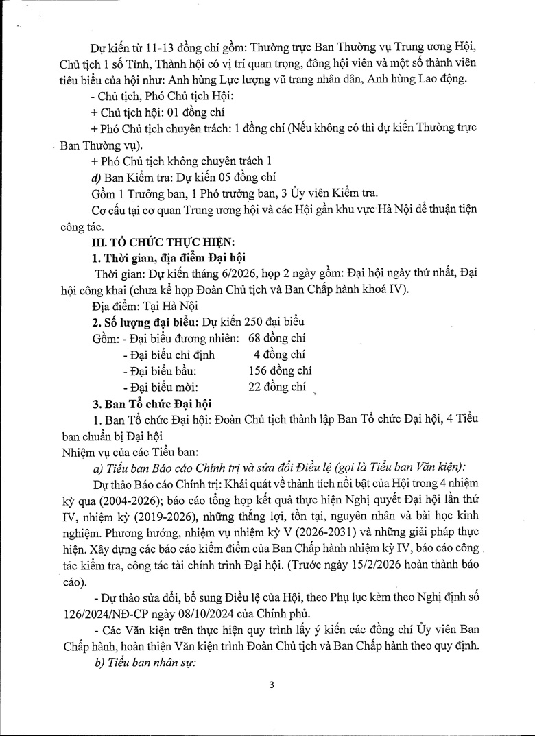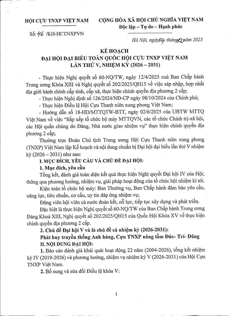 Kế hoạch tổ chức Đại hội đại biểu toàn quốc Hội Cựu TNXP Việt Nam lần thứ V