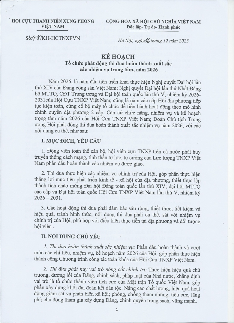 - Kế hoạch tổ chức Đại hội đại biểu toàn quốc Hội Cựu TNXP Việt Nam lần thứ V