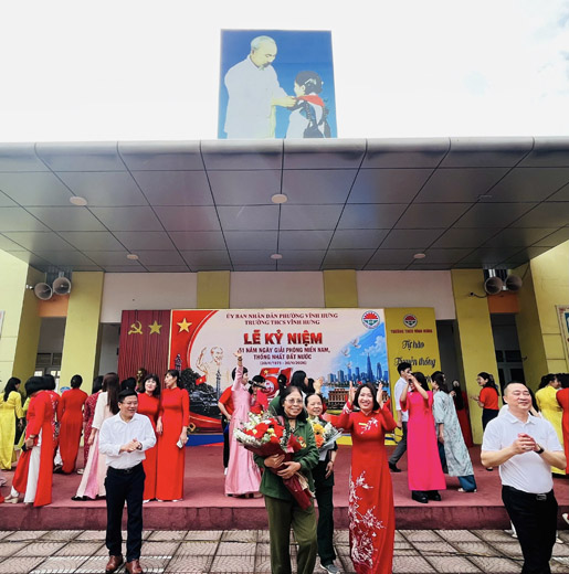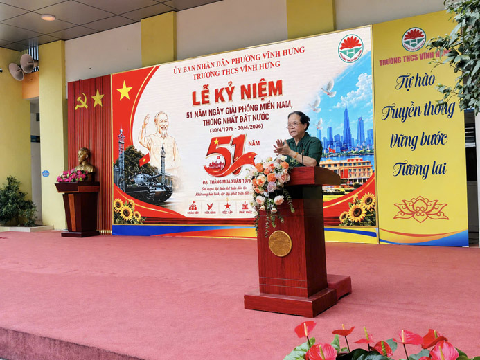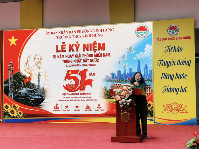 Sáng ngày 28/4/2026, trong không khí hào hùng của những ngày tháng Tư lịch sử, trường Trung học cơ sở (THCS) Vĩnh Hưng, Hà Nội đã long trọng tổ chức buổi lễ kỷ niệm 51 năm ngày Giải phóng miền Nam, thống nhất đất nước (30/4/1975 – 30/4/2026). Không chỉ là một nghi lễ kỷ niệm, buổi sinh hoạt truyền thống này đã trở thành một không gian lắng đọng, nơi những trang sử hào hùng của dân tộc được tái hiện chân thực qua lời kể của những người trong cuộc.