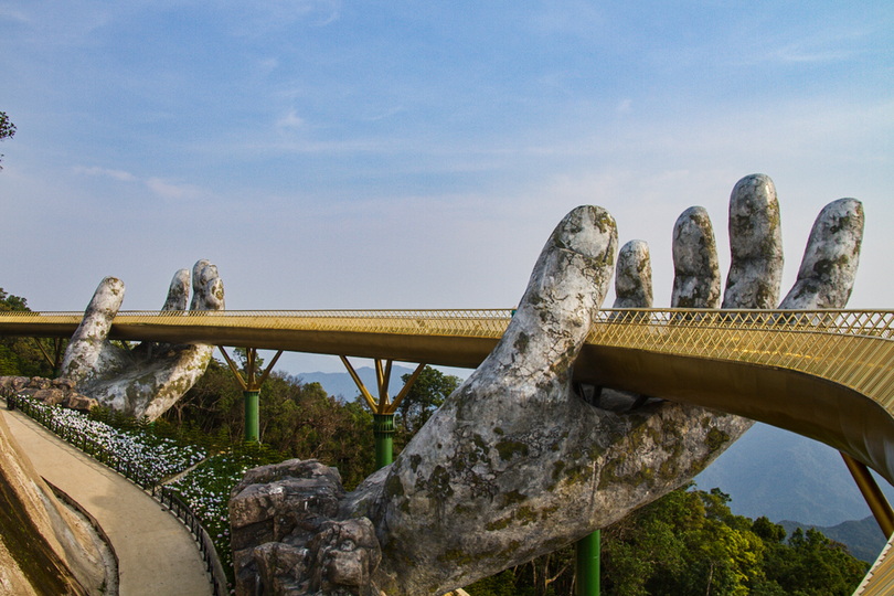 Cầu Vàng (Bà Nà Hills – Đà Nẵng) với kiến trúc đặc biệt với tạo hình đôi bàn tay khổng lồ nâng đỡ.