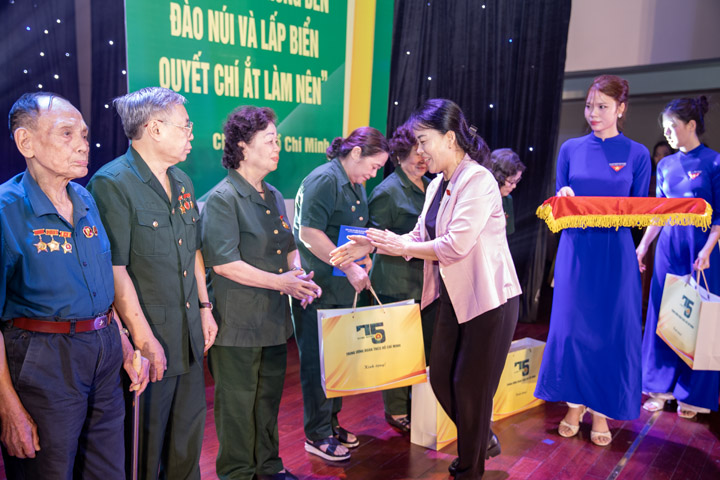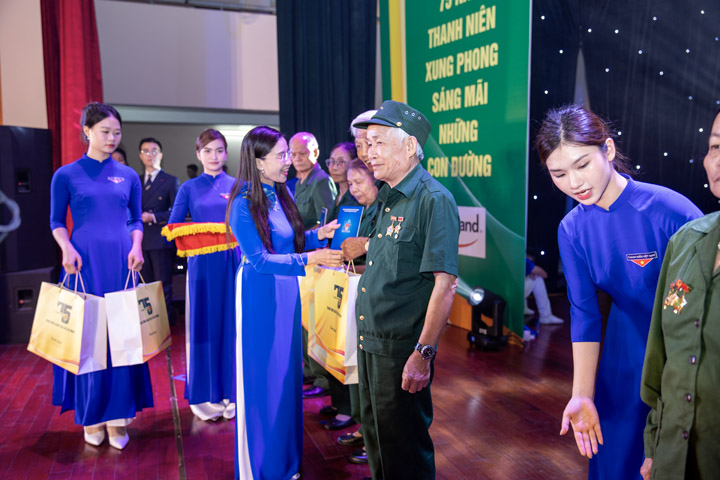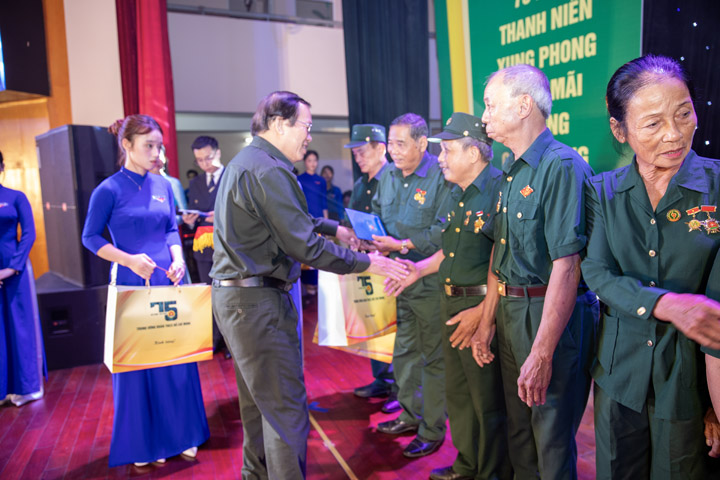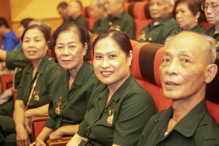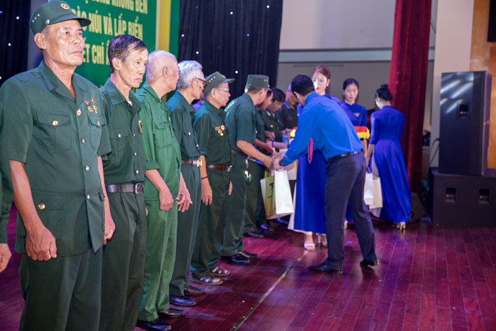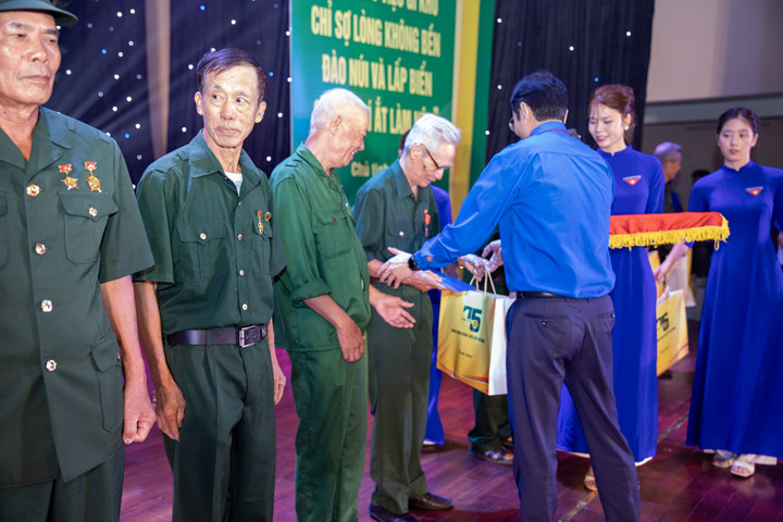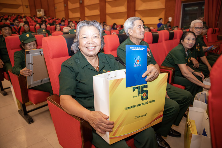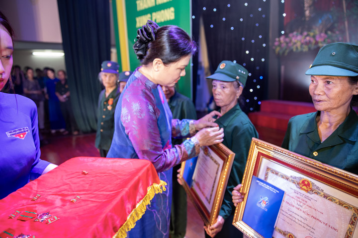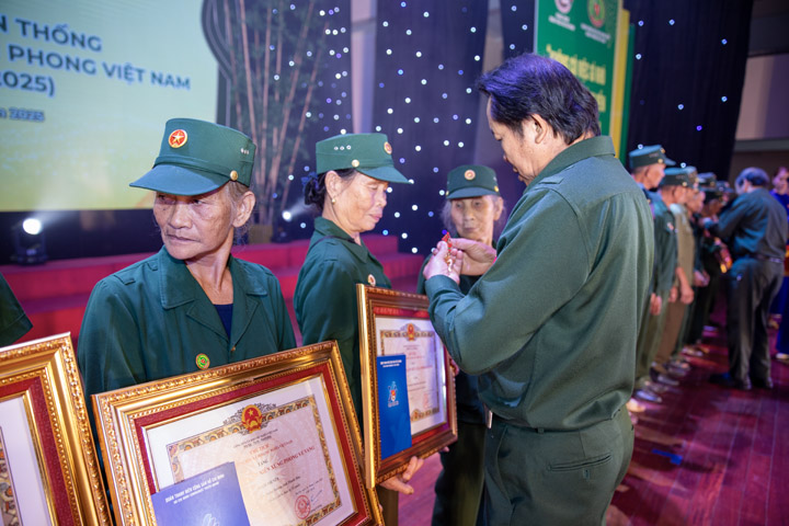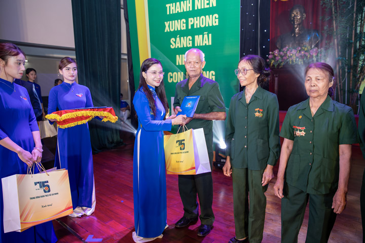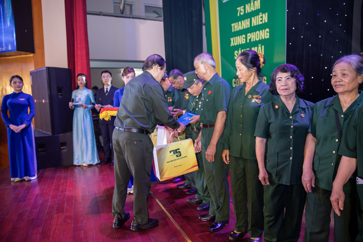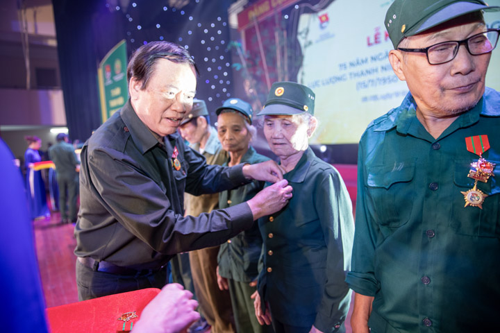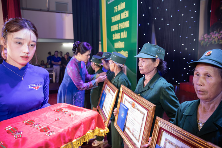 Cũng tại buổi lễ, Ban tổ chức đã trao “Huy chương Thanh niên xung phong vẻ vang” cho 22 cựu TNXP đến từ tỉnh Thanh Hóa (ảnh trên), đại diện cho hơn 1.600 cựu TNXP đã nhận được quyết định của Chủ tịch nước; trao tặng những phần quà thiết thực cho 50 cựu TNXP có hoàn cảnh khó khăn các tỉnh Hải Phòng, Ninh Bình, Phú Thọ, Bắc Ninh, Hà Nội, Hưng Yên (ảnh dưới).
