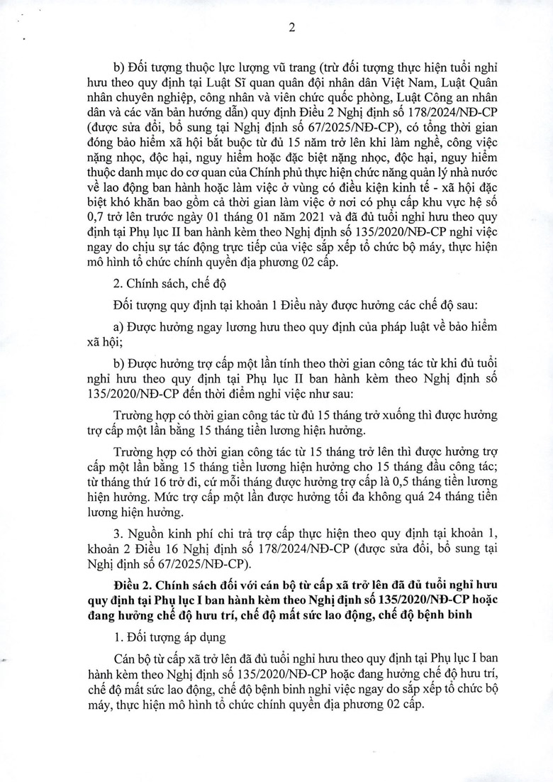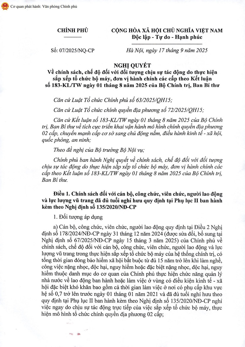 Nghị quyết 07/2025/NQ-CP về chính sách, chế độ đối với đối tượng chịu sự tác động do thực hiện sắp xếp tổ chức bộ máy, đơn vị hành chính các cấp theo Kết luận số 183-KL/TW ngày 01 tháng 8 năm 2025 của Bộ Chính trị, Ban Bí thu’