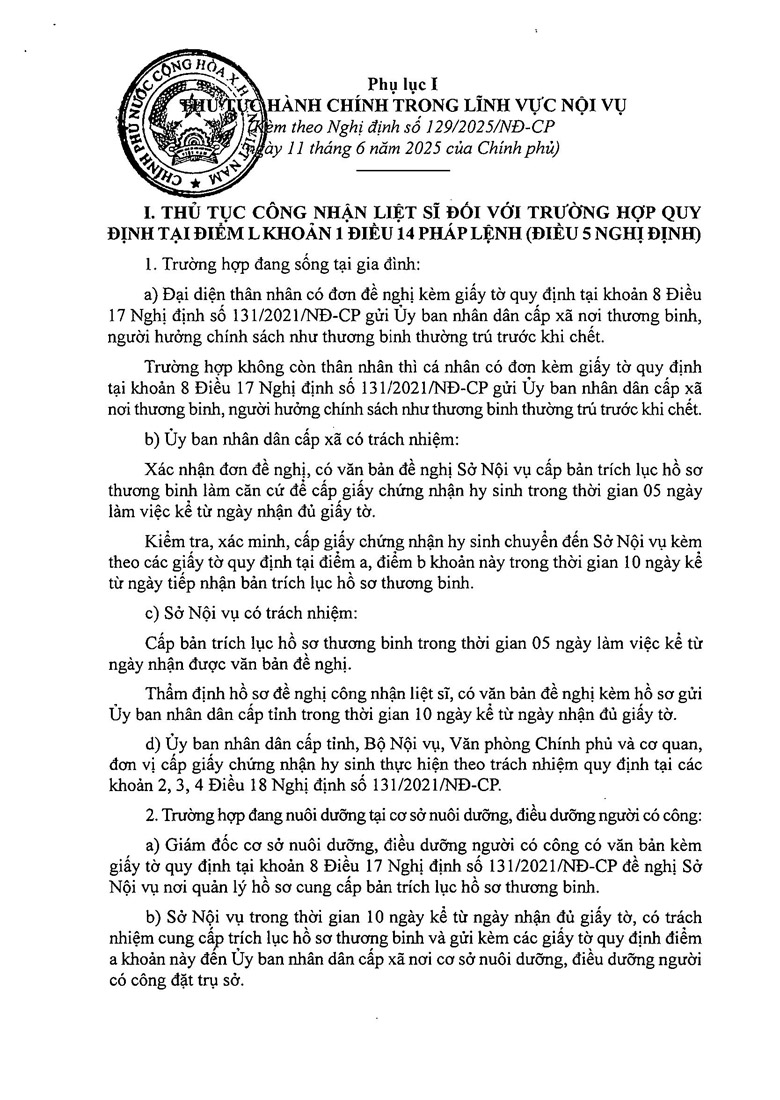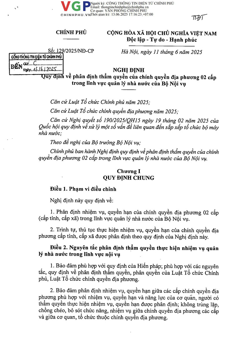 Nghị định 129 quy định về phân định thẩm quyền của chính quyền địa phương 02 cấp trong lĩnh vực quản lý nhà nước của Bộ Nội vụ