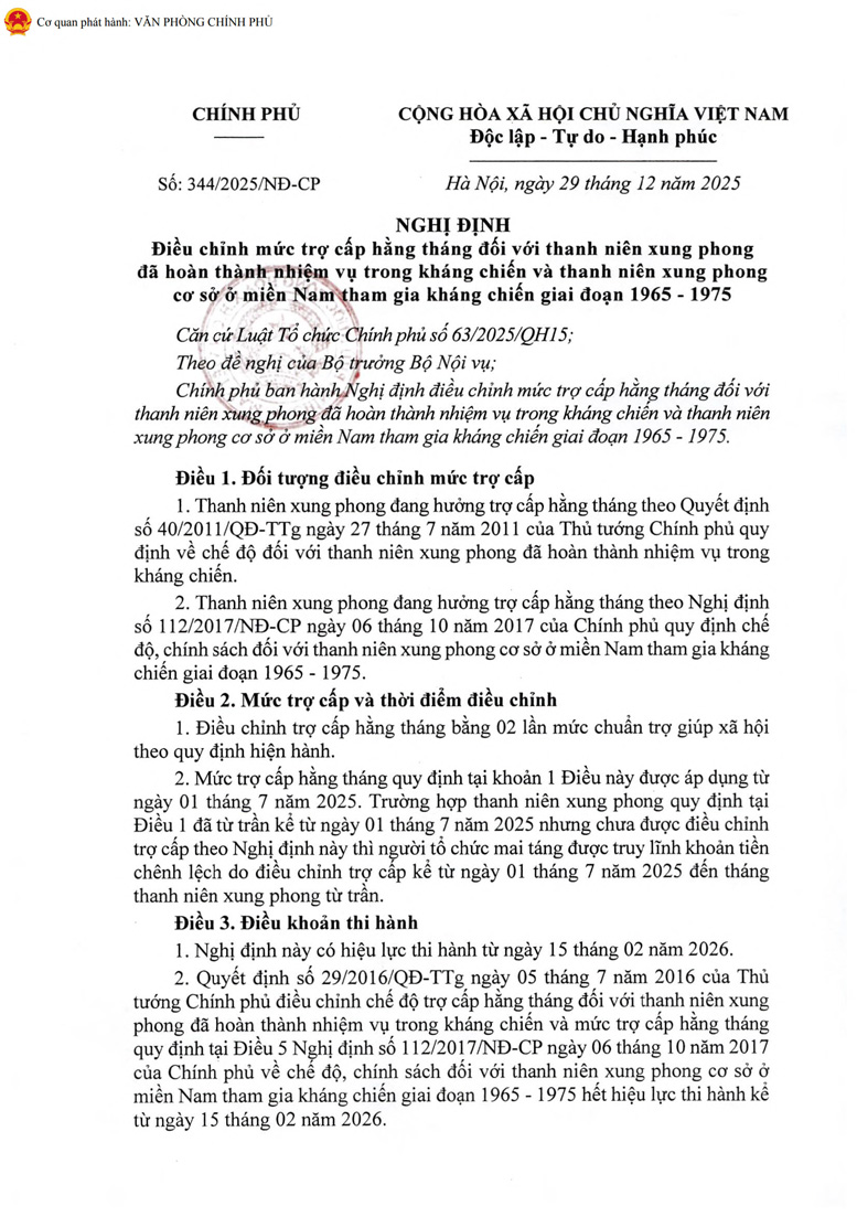 Nghị định 344 Điều chỉnh mức trợ cấp hằng tháng đối với TNXP đã hoàn thành nhiệm vụ trong kháng chiến và TNXP cơ sở ở miền Nam tham gia kháng chiến giai đoạn 1965 – 1975