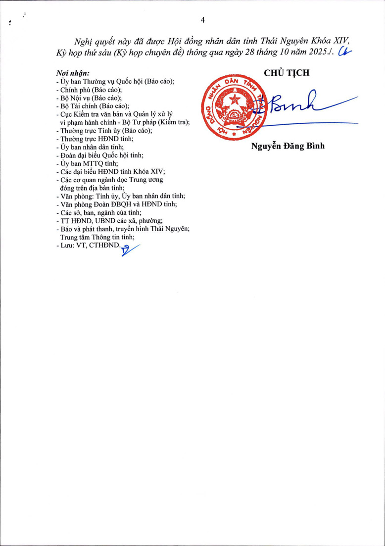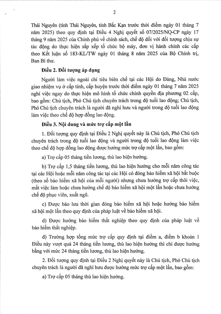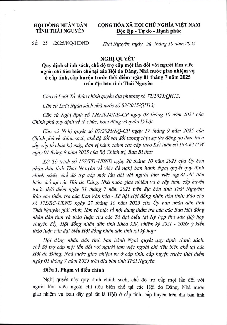 Nghị quyết của HĐND tỉnh Thái Nguyên quy định chính sách, chế độ trợ cấp một lần đối với người làm việc ngoài chỉ tiêu biên chế tại các Hội do Đảng, Nhà nước giao nhiệm vụ ở cấp tỉnh, cấp huyện