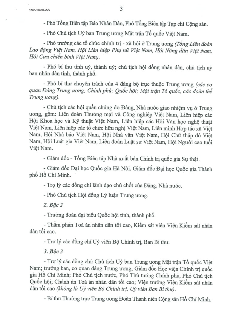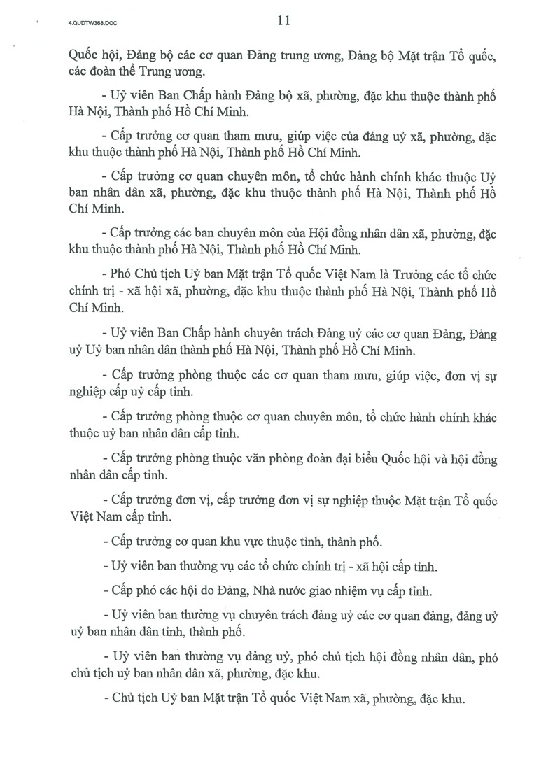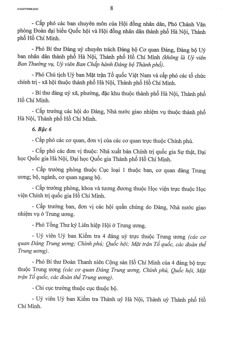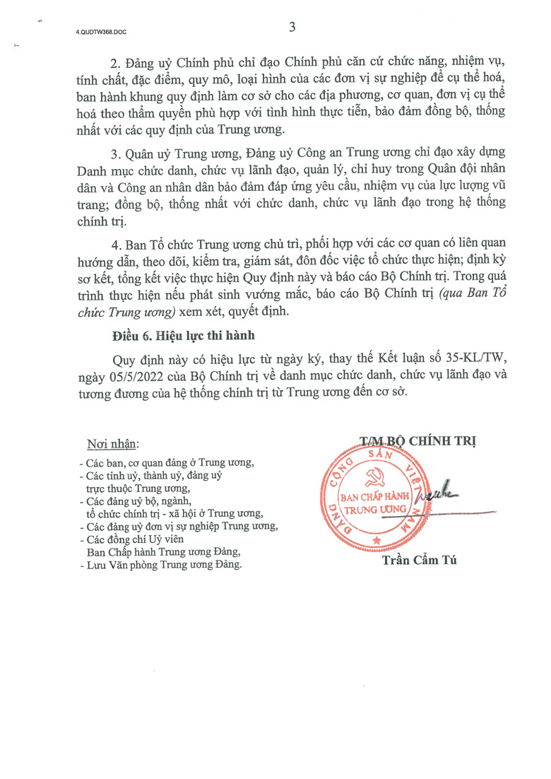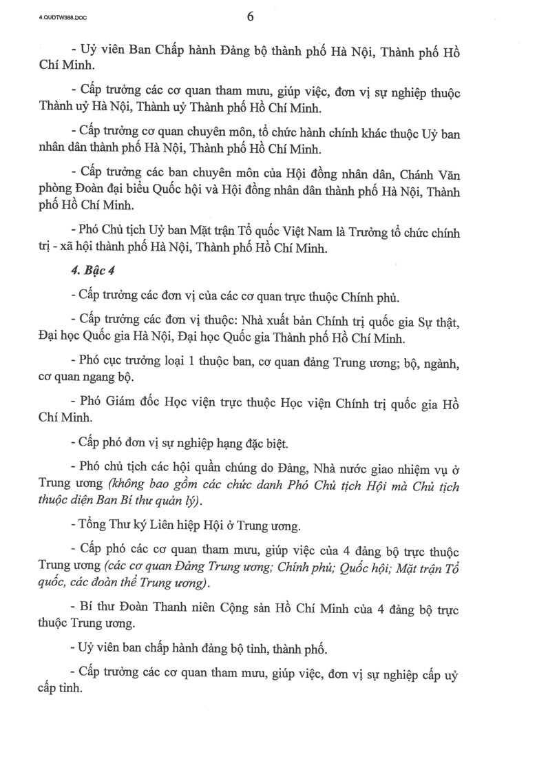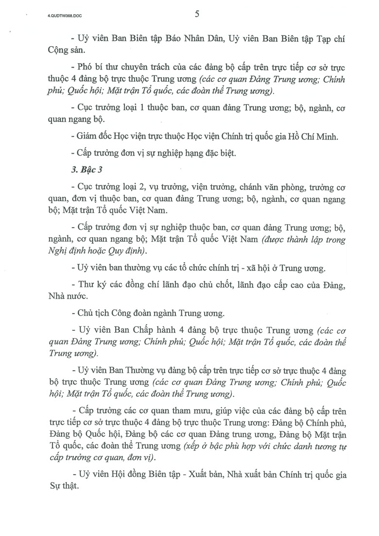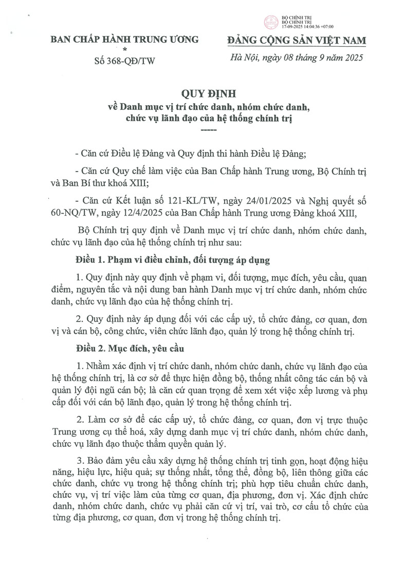 Quy định 368 về danh mục vị trí chức danh, nhóm chức danh, chức vụ lãnh đạo của hệ thống chính trị
