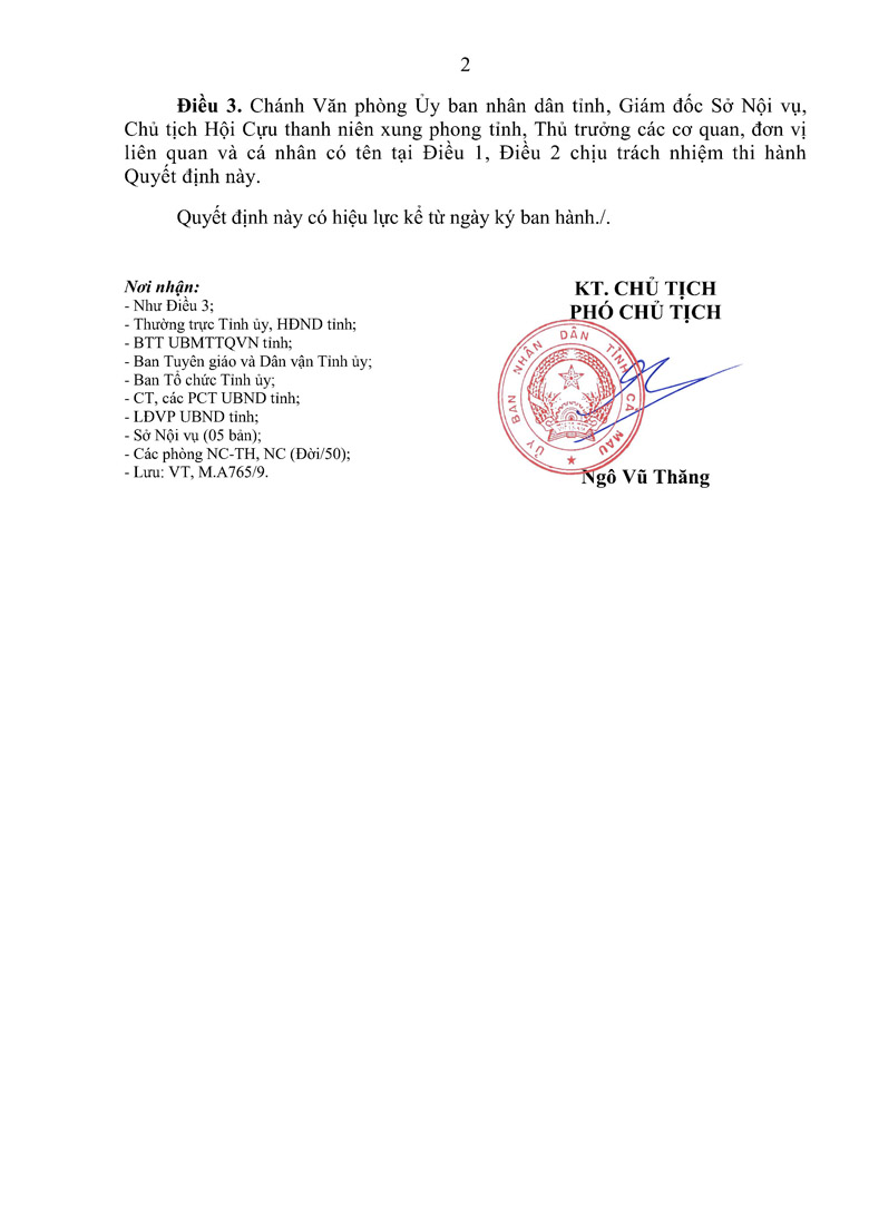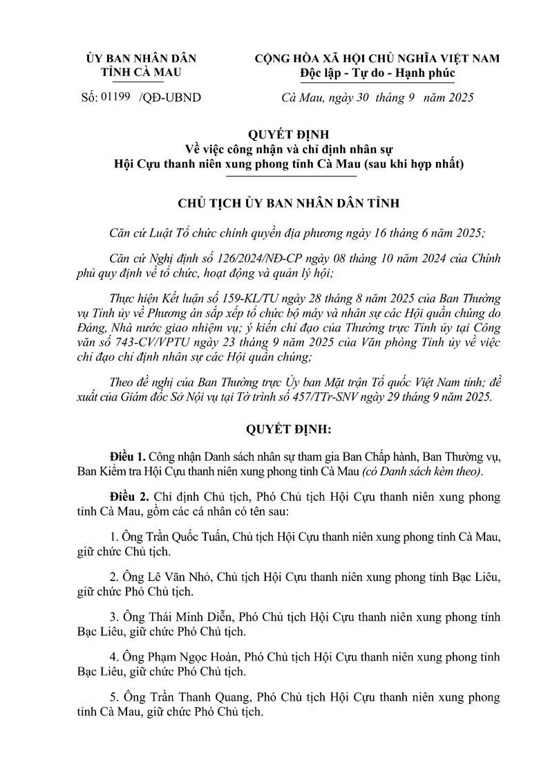 Quyết định 0119 công nhận và chỉ định nhân sự Hội Cựu TNXP tỉnh Cà Mau