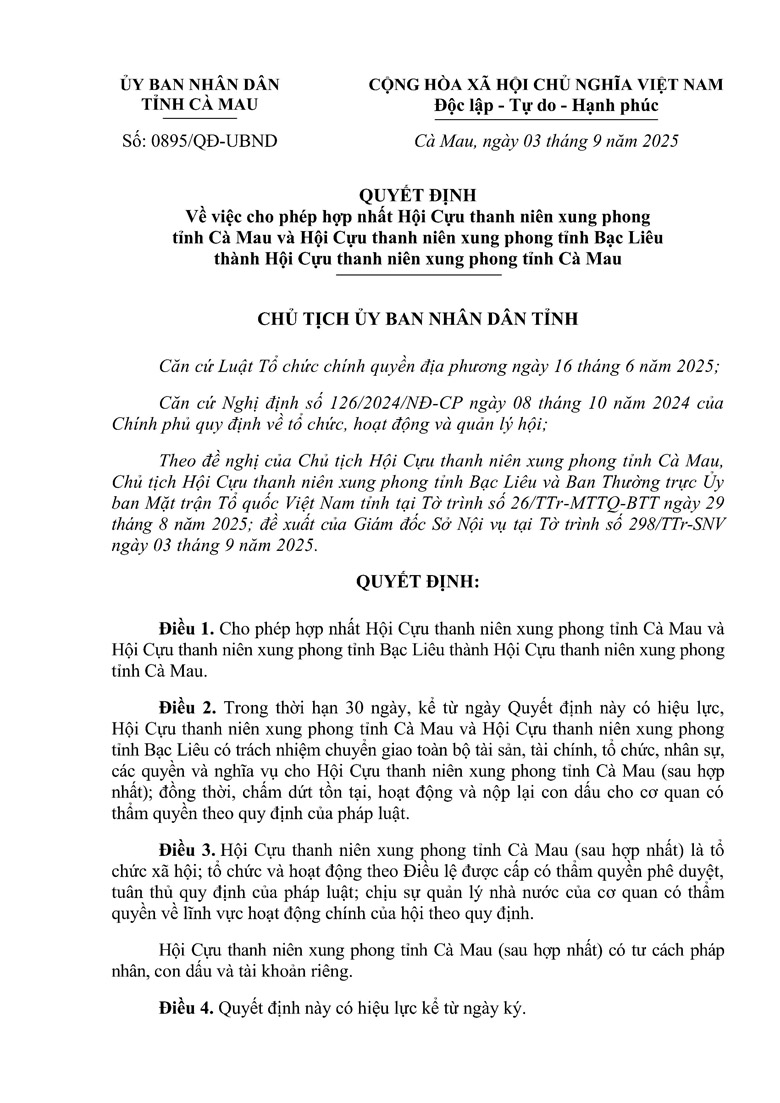Quyết định 0895 cho phép hợp nhất Hội Cựu TNXP tỉnh Cà Mau và Hội Cựu TNXP tỉnh Bạc Liêu thành Hội Cựu TNXP tỉnh Cà Mau