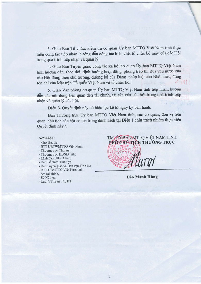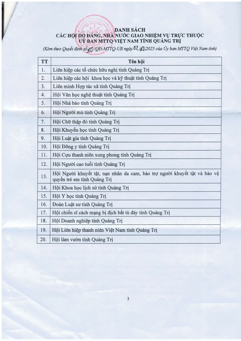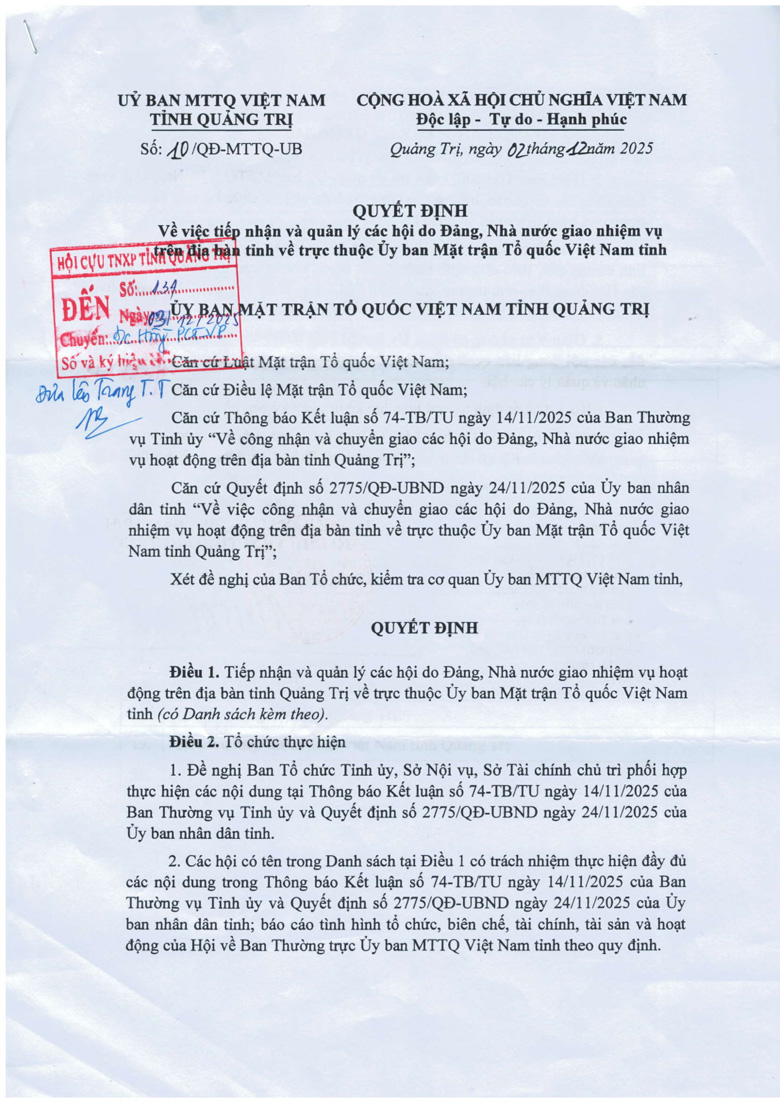 Quyết định 10 tiếp nhận và quản lý các hội do Đảng, Nhà nước giao nhiệm vụ về trực thuộc UBMTTQ Việt Nam tỉnh Quảng Trị