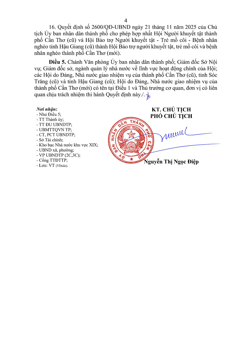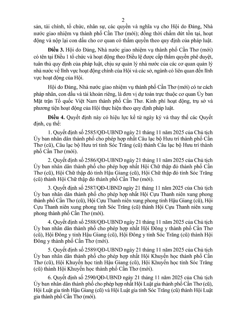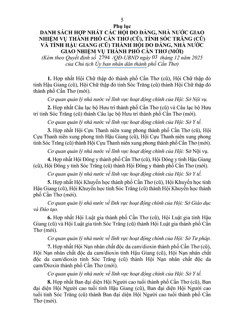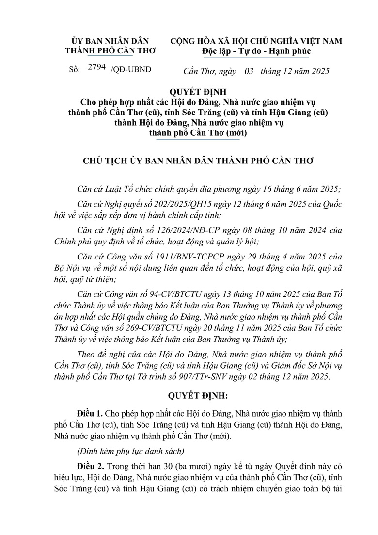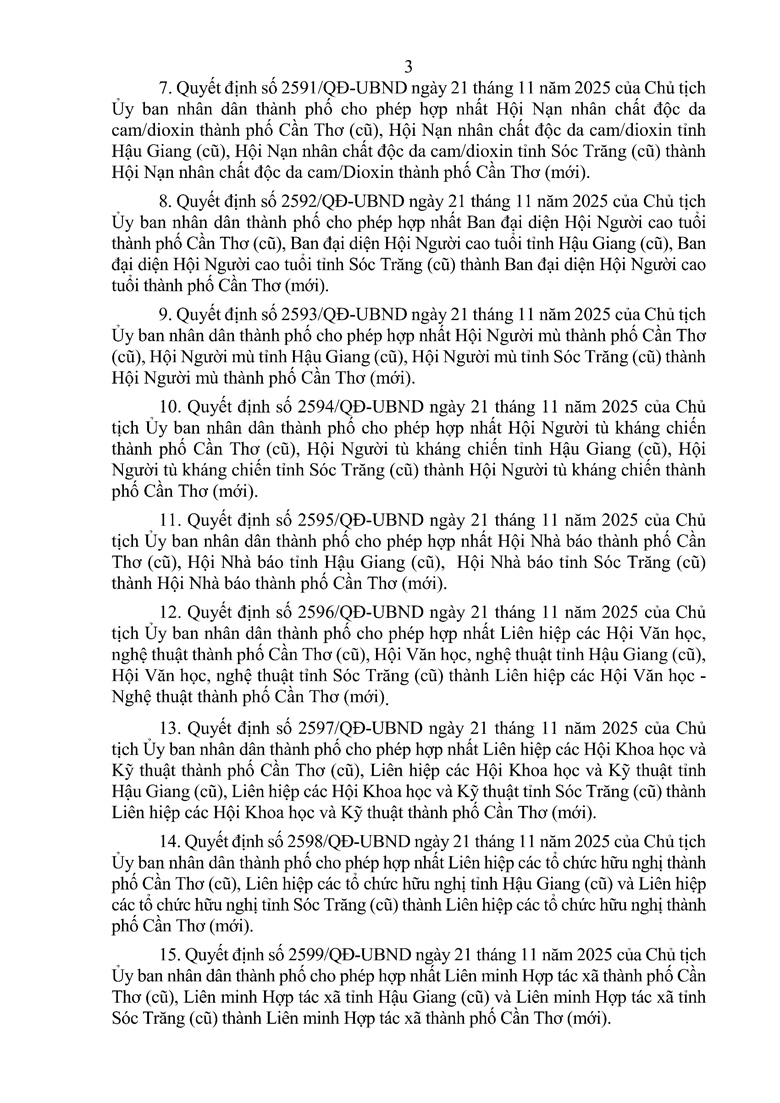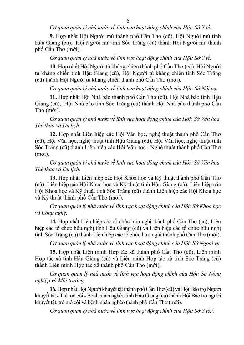 - Quyết định hợp nhất Hội Cựu TNXP thành phố Cần Thơ (cũ), Hội Cựu TNXP tỉnh Hậu Giang (cũ), Hội Cựu TNXP tỉnh Sóc Trăng (cũ) thành Hội Cựu Thanh niên xung phong thành phố Cần Thơ (mới)