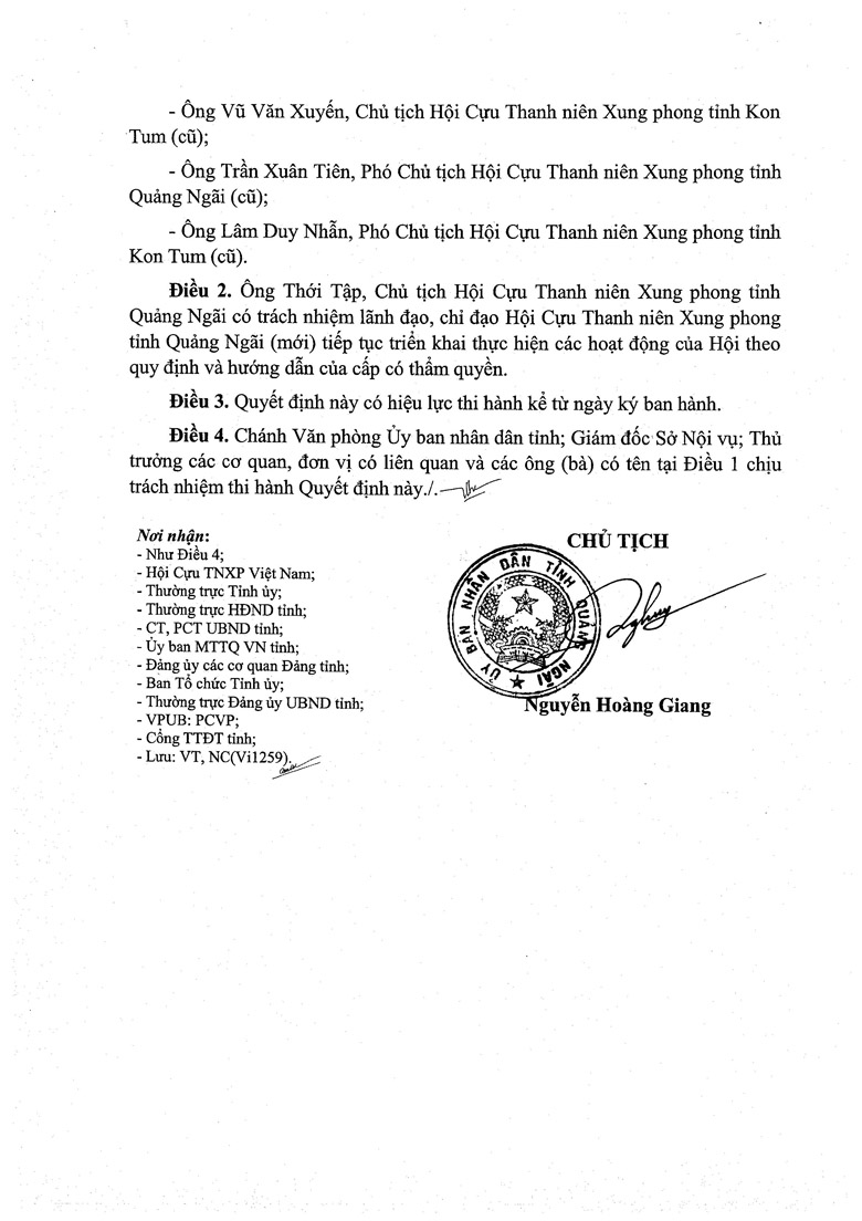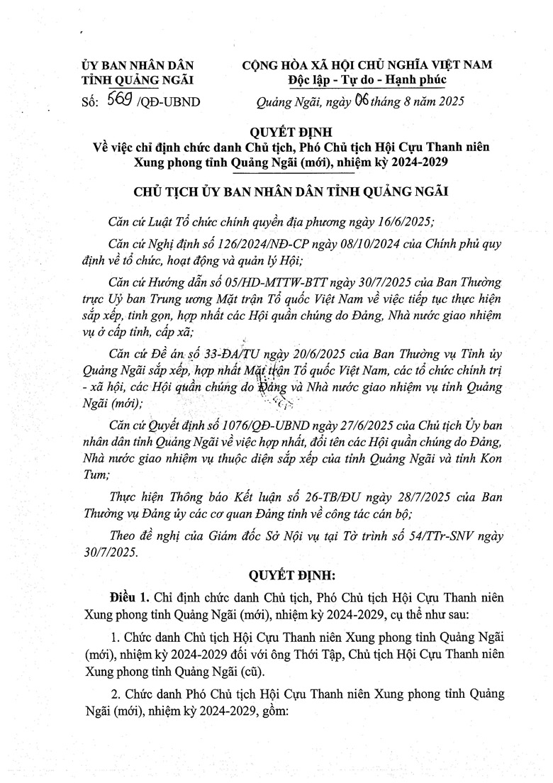 Quyết định 569 chỉ định chức danh Chủ tịch, Phó Chủ tịch Hội Cựu TNXP tỉnh Quảng Ngãi (mới),
