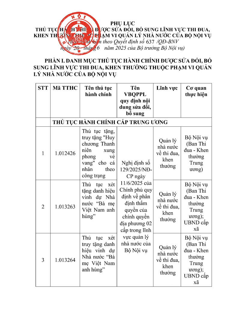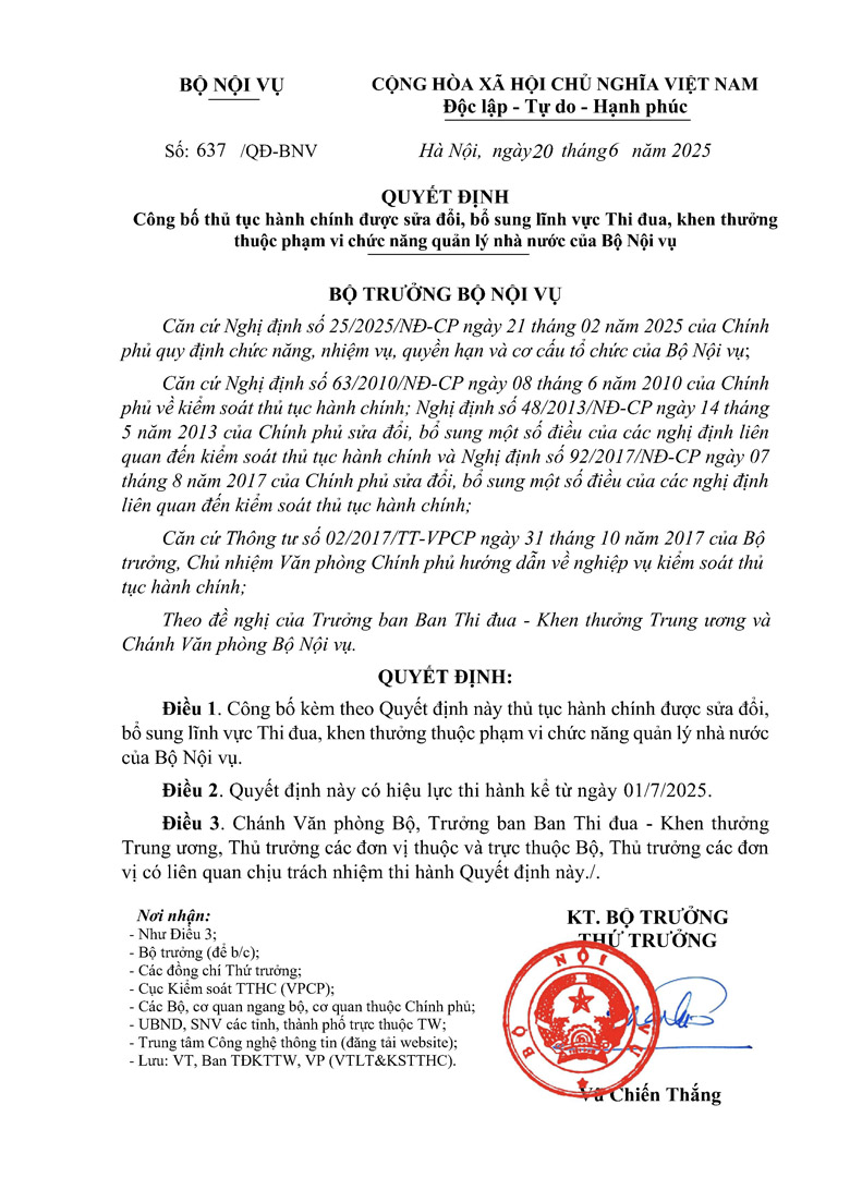 Quyết định 637 công bố thủ tục hành chính được sửa đổi, bổ sung lĩnh vực Thi đua, khen thưởng thuộc phạm vi chức năng quản lý nhà nước của Bộ Nội vụ