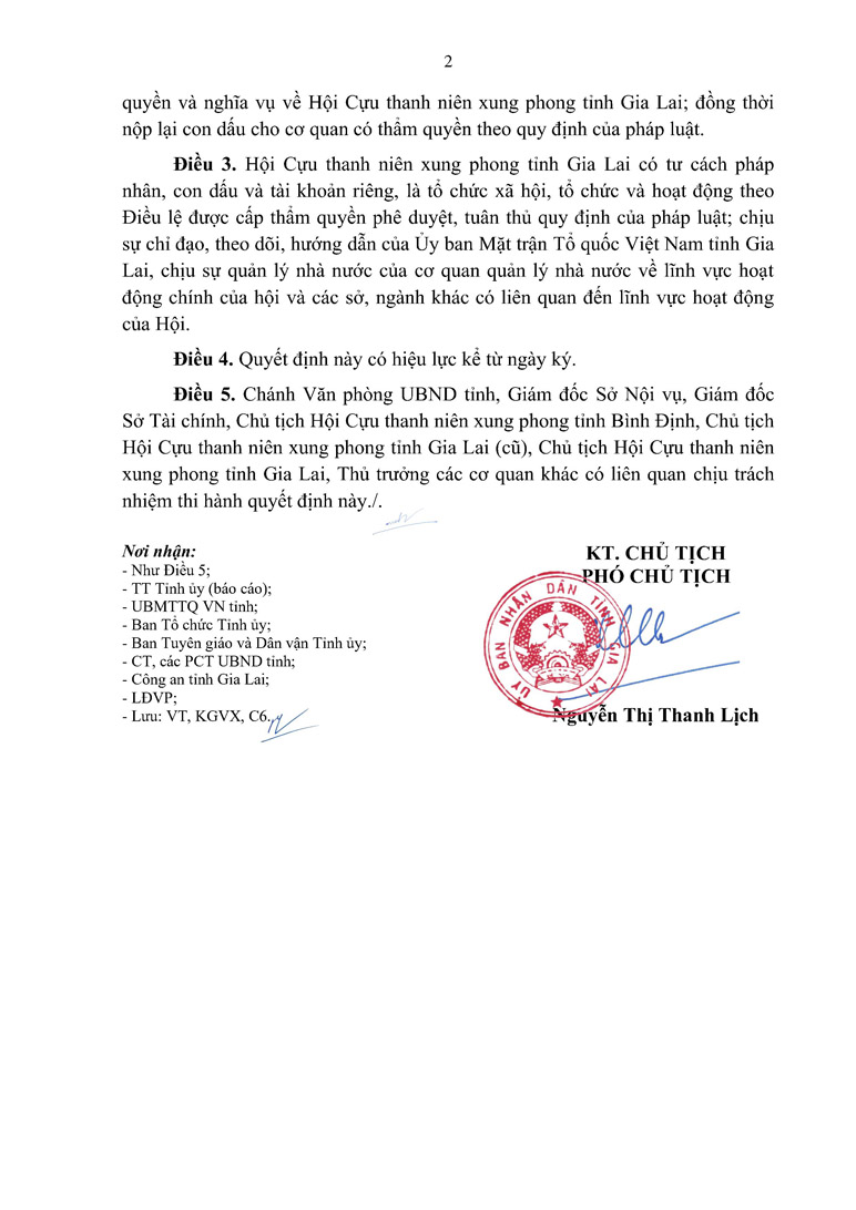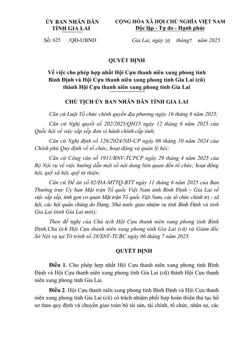Quyết định cho phép hợp nhất Hội Cựu thanh niên xung phong tỉnh Bình Định và Hội Cựu thanh niên xung phong tỉnh Gia Lai (cũ) thành Hội Cựu thanh niên xung phong tỉnh Gia Lai