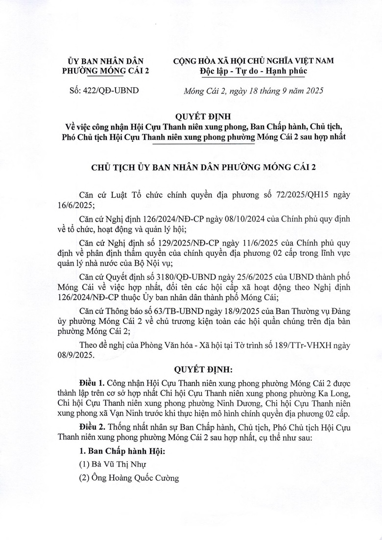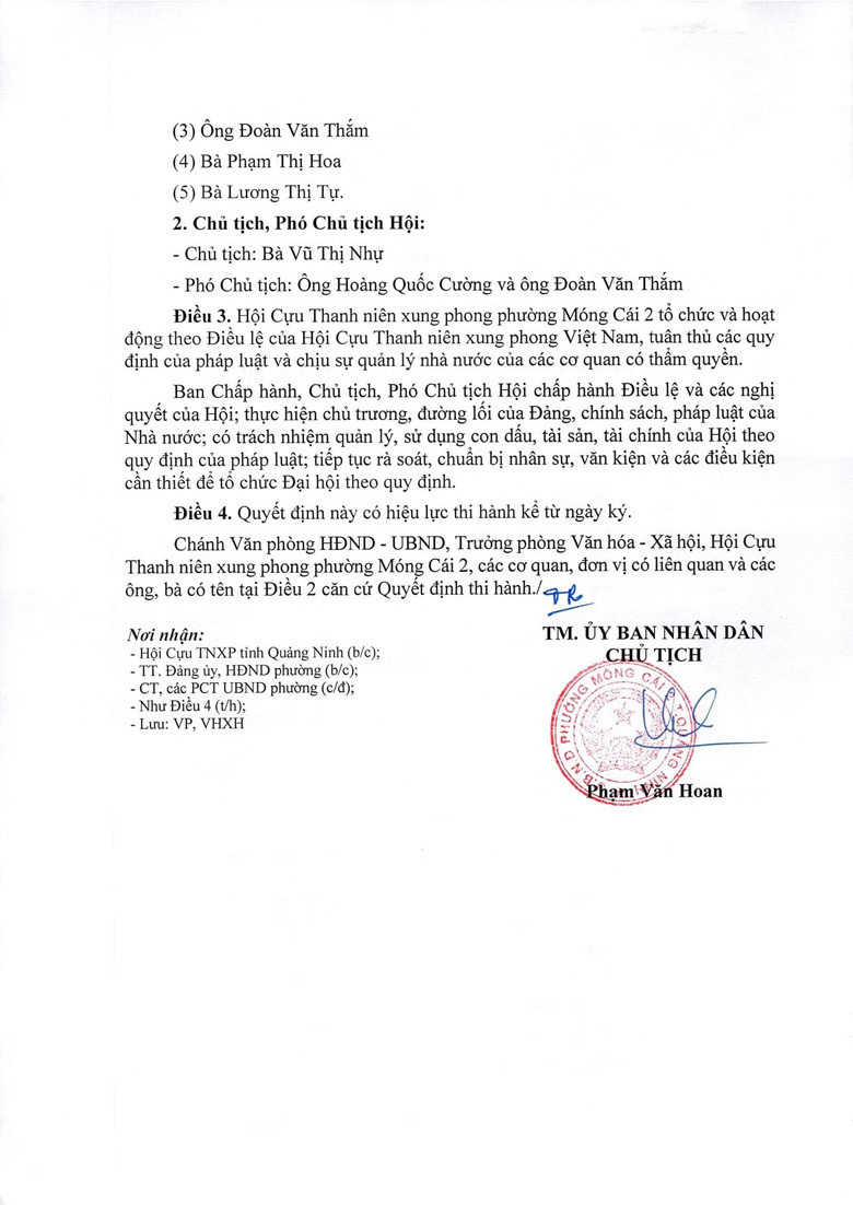 Quyết định công nhận Hội Cựu TNXP, Ban Chấp hành, Chủ tịch, Phó Chủ tịch Hội Cựu TNXP phường Móng Cái 2 sau hợp nhất