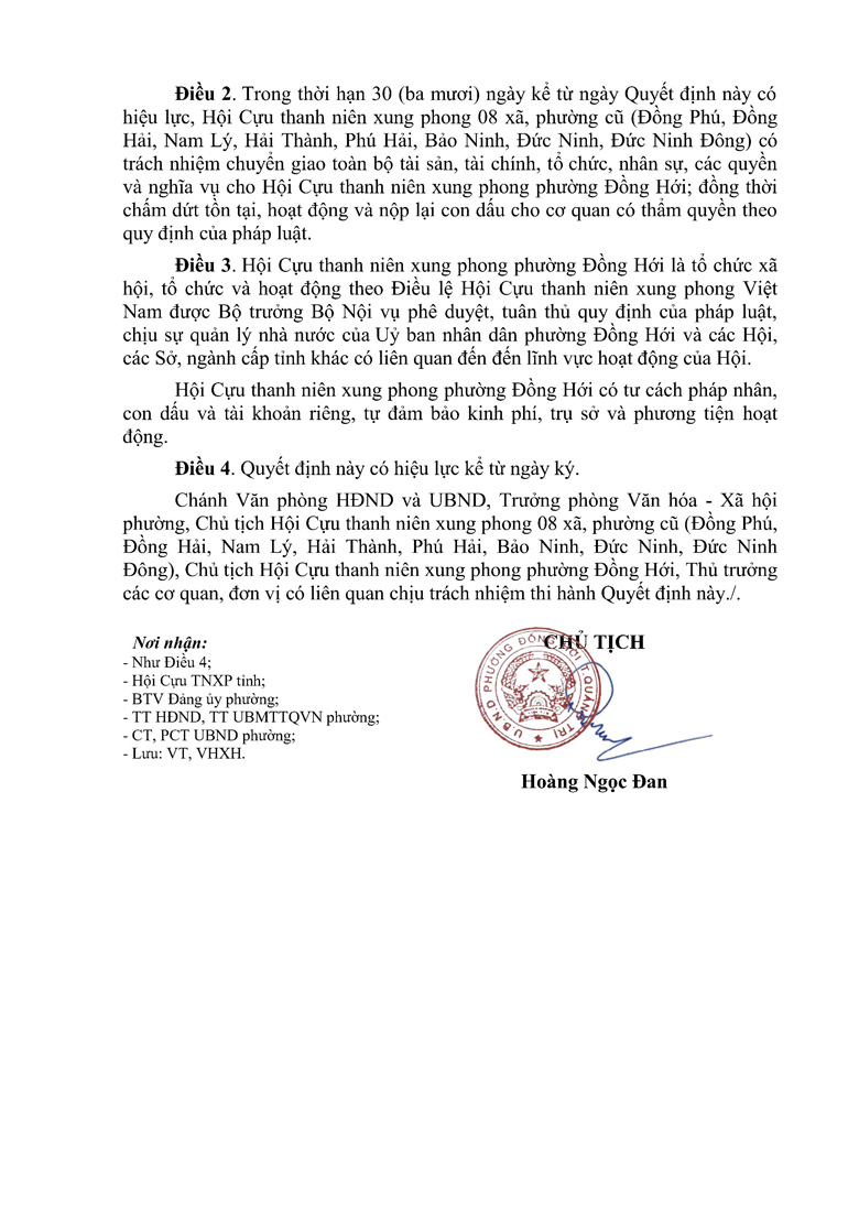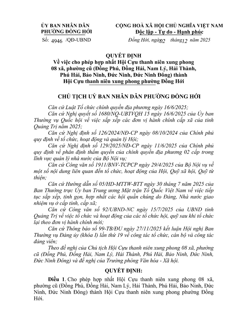 Quyết định của UBND hợp nhất Hội Cựu TNXP 08 xã, phường cũ (Đồng Phú, Đồng Hải, Nam Lý, Hải Thành, Phú Hải, Bảo Ninh, Đức Ninh, Đức Ninh Đông) thành Hội Cựu TNXP phường Đồng Hới, tỉnh Quảng Trị
