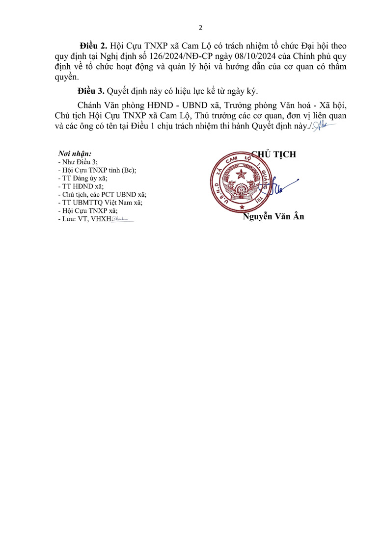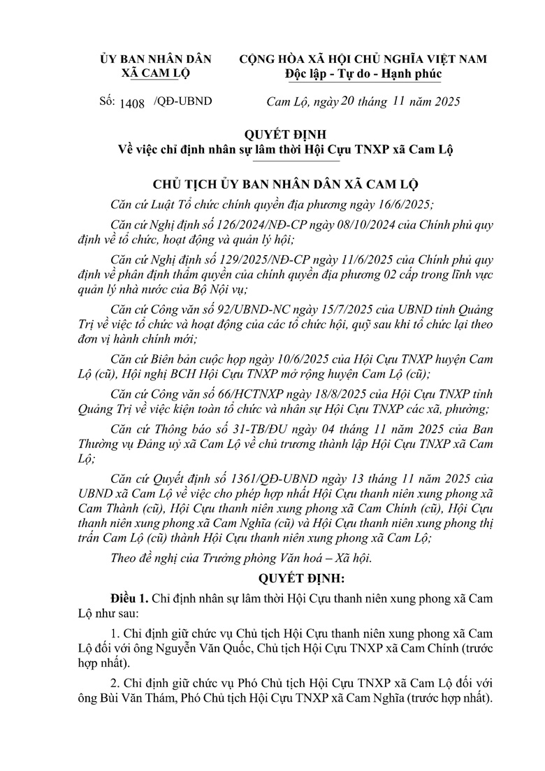 Quyết định của UBND xã Cam Lộ chỉ định nhân sự lâm thời Hội Cựu TNXP xã