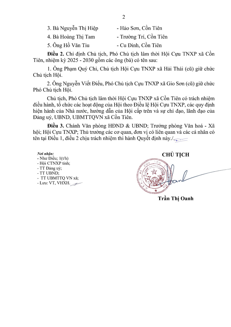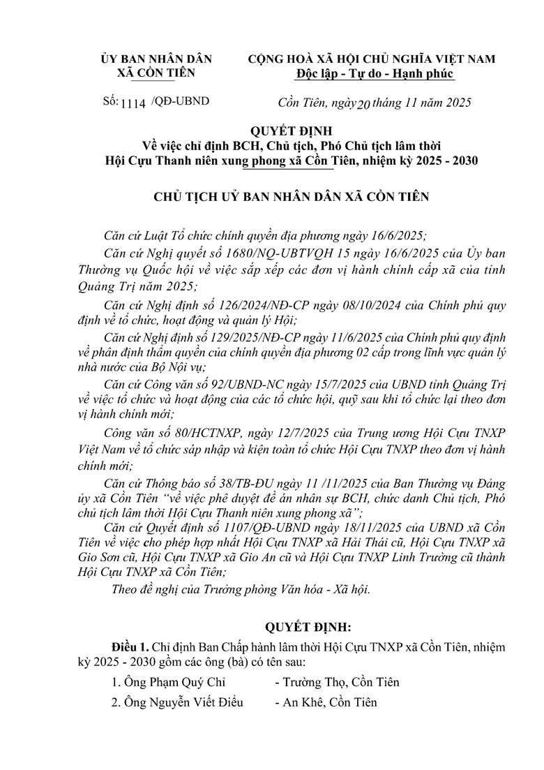 Quyết định của UBND xã Cồn Tiên chỉ định BCH, Chủ tịch, Phó Chủ tịch lâm thời Hội Cựu TNXP xã, nhiệm kỳ 2025 – 2030