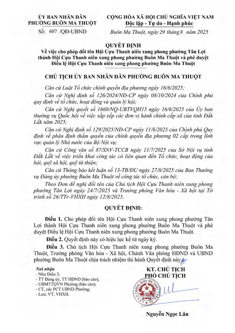 Quyết định đổi tên Hội Cựu TNXP phường Tân Lợi thành Hội Cựu TNXP phường Buôn Ma Thuột và phê duyệt Điều lệ Hội Cựu TNXP phường Buôn Ma Thuột