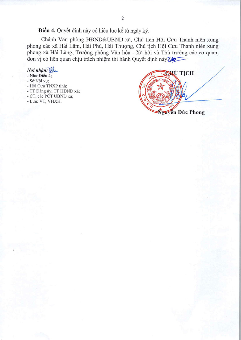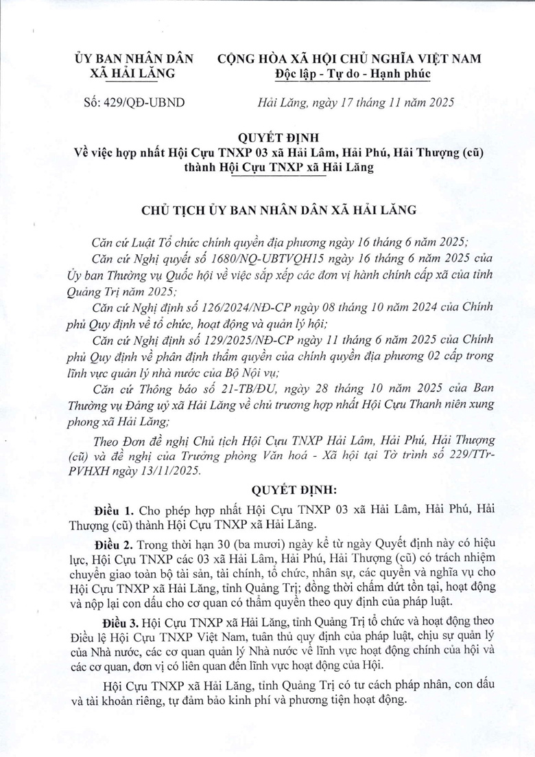 Quyết định hợp nhất Hội Cựu TNXP 03 xã Hải Lâm, Hải Phú, Hải Thượng (cũ) thành Hội Cựu TNXP xã Hải Lăng
