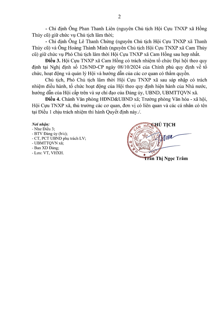 Quyết định hợp nhất Hội Cựu TNXP các xã cũ thành Hội Cựu TNXP xã Cam Hồng và chỉ định nhân sự lâm thời