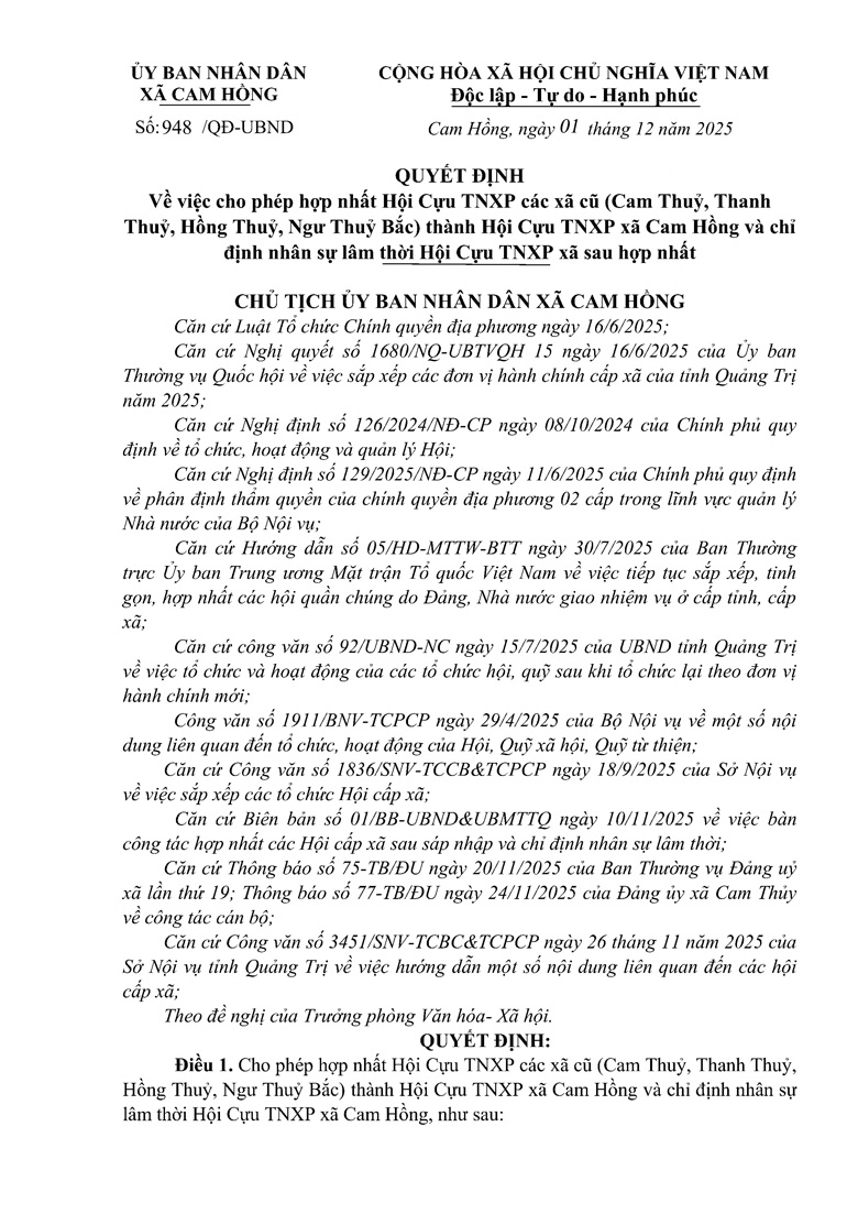 Quyết định hợp nhất Hội Cựu TNXP các xã cũ thành Hội Cựu TNXP xã Cam Hồng và chỉ định nhân sự lâm thời