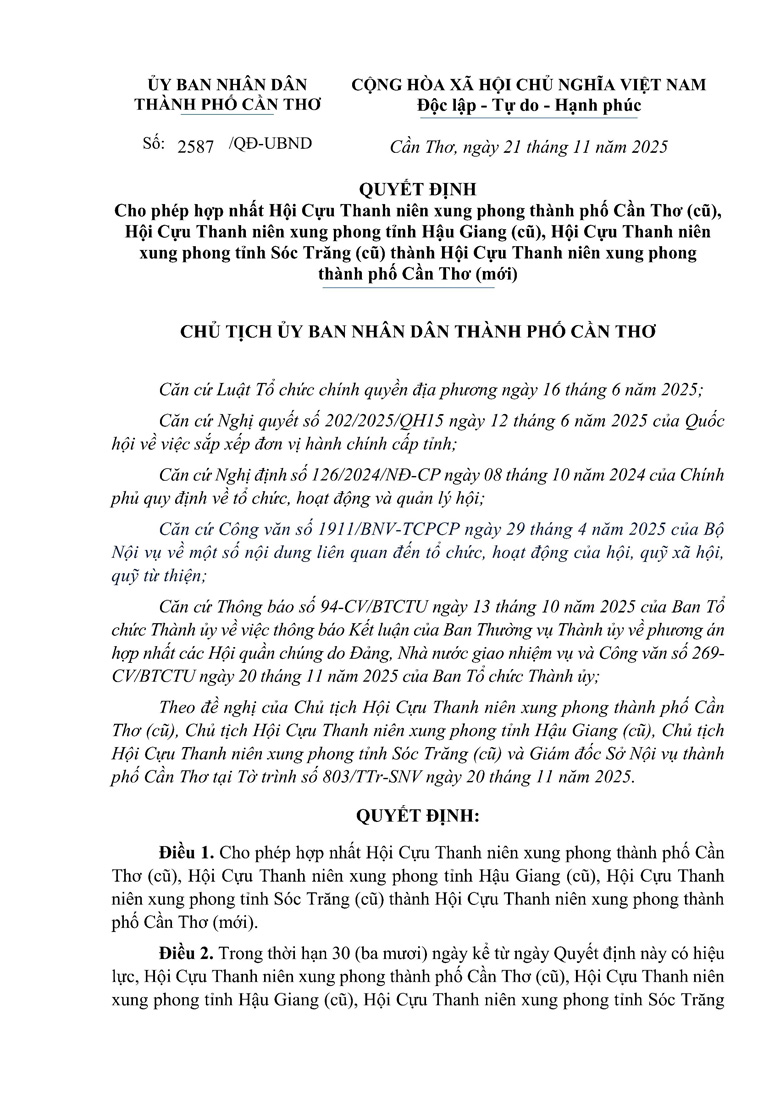 Quyết định hợp nhất Hội Cựu TNXP thành phố Cần Thơ (cũ), Hội Cựu TNXP tỉnh Hậu Giang (cũ), Hội Cựu TNXP tỉnh Sóc Trăng (cũ) thành Hội Cựu TNXP thành phố Cần Thơ (mới)