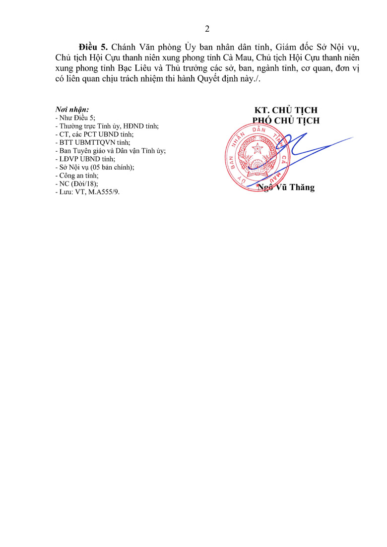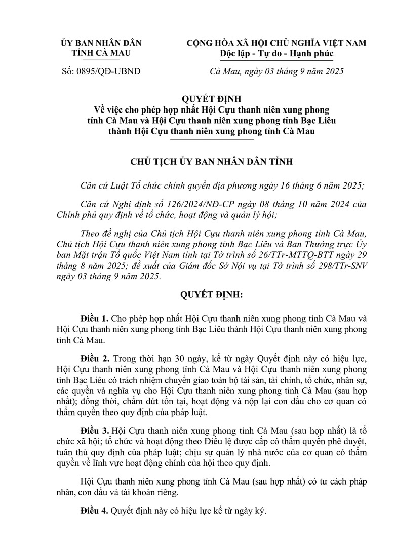 Quyết định hợp nhất Hội Cựu TNXP tỉnh Cà Mau và Hội Cựu TNXP tỉnh Bạc Liêu thành Hội Cựu TNXP tỉnh Cà Mau