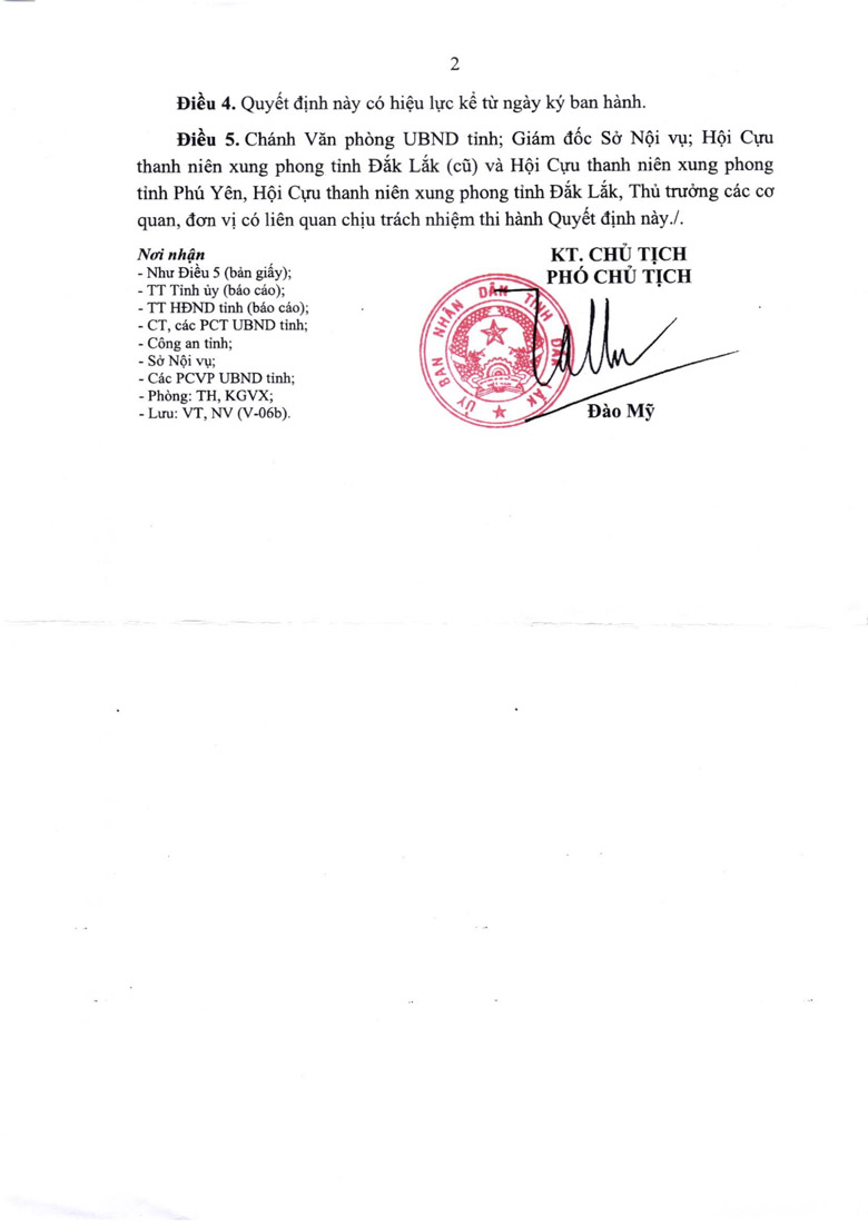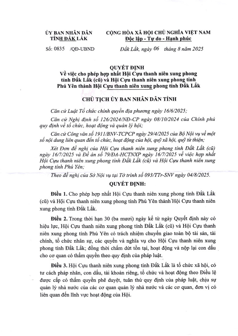 Quyết định hợp nhất Hội Cựu TNXP tỉnh Đắk Lắk (cũ) và Hội Cựu TNXP tỉnh Phú Yên thành Hội Cựu TNXP tỉnh Đắk Lắk